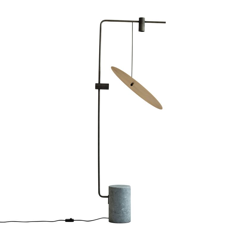 The Moon - это минималистичный торшер, созданный из геометрических форм, где каждый компонент идеально сбалансирован друг с другом. Торшер имеет два источника света, расположенных в качестве композиционных точек опоры на кронштейне из оксидированной латуни. Большой круглый абажур свисает с кронштейна в качестве плавающего отражателя в пространстве. Абажур из матовой латуни подсвечивается с обеих сторон, создавая теплое и мягкое освещение. Светильник The Moon закреплён на цилиндрическом основании из неполированного серого мрамора, стабилизирующем конструкцию.