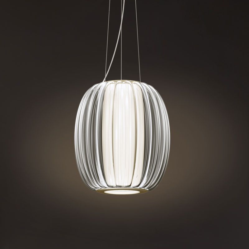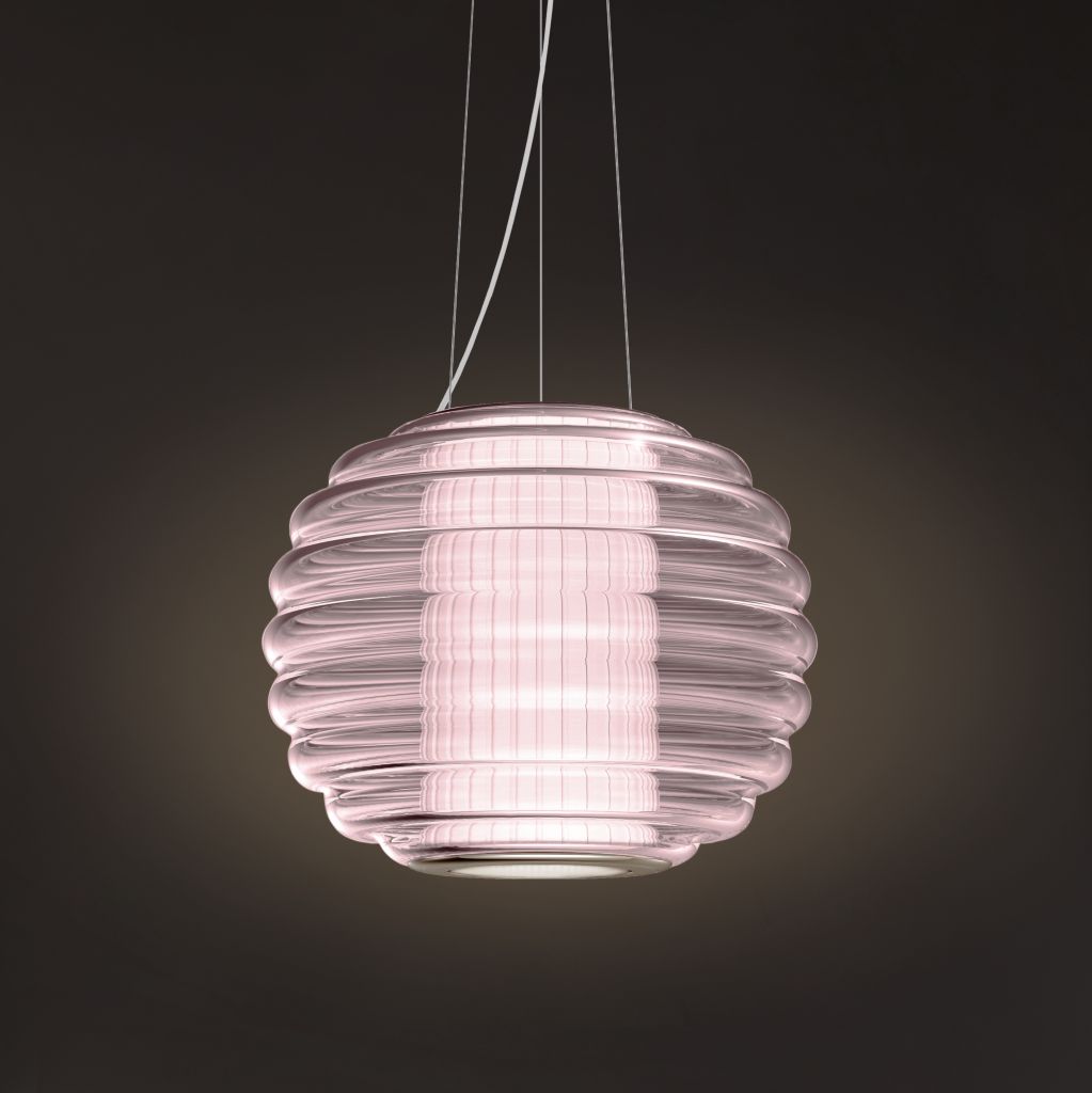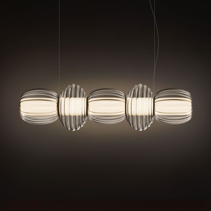 Рассеиватели из дутого стекла и плиссированной ткани гармонично сочетаются в подвесных, настольных и напольных светильниках.