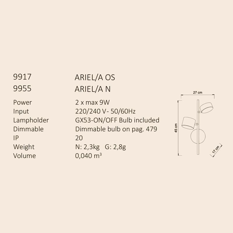 Коллекция Ariel выполнена из металла с чёрным тиснением или матовой латунной отделкой и оснащена источниками света GX53. Подвесной светильник доступен в конфигурациях с 6 или 5 лампами, что обеспечивает равномерное освещение. Регулируемый настенный светильник с двумя лампами обеспечивает максимальную универсальность для направленного и функционального освещения.