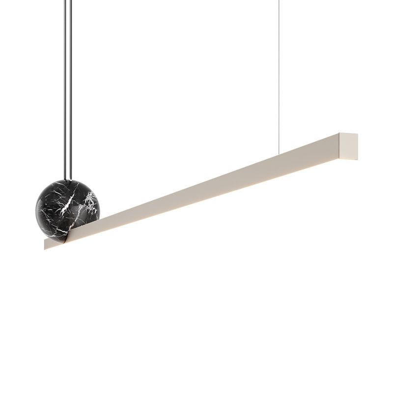 Лаконичный металлический профиль формирует чёткую архитектурную линию, вдоль которой интегрирован источник света — LED-матрица мощностью 24W, обеспечивающая мягкое равномерное освещение. Композицию дополняет акцентный элемент — шар из натурального мрамора Calacatta или Black Marquinia, придающий светильнику глубину и материальность.