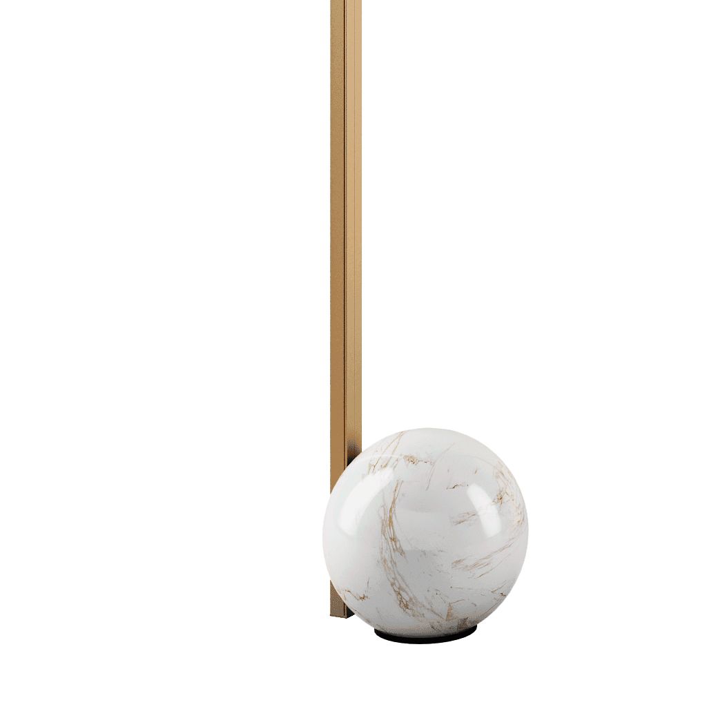Лаконичный металлический профиль формирует чёткую архитектурную линию, вдоль которой интегрирован источник света — LED-матрица мощностью 24W, обеспечивающая мягкое равномерное освещение. Композицию дополняет акцентный элемент — шар из натурального мрамора Calacatta или Black Marquinia, придающий светильнику глубину и материальность.