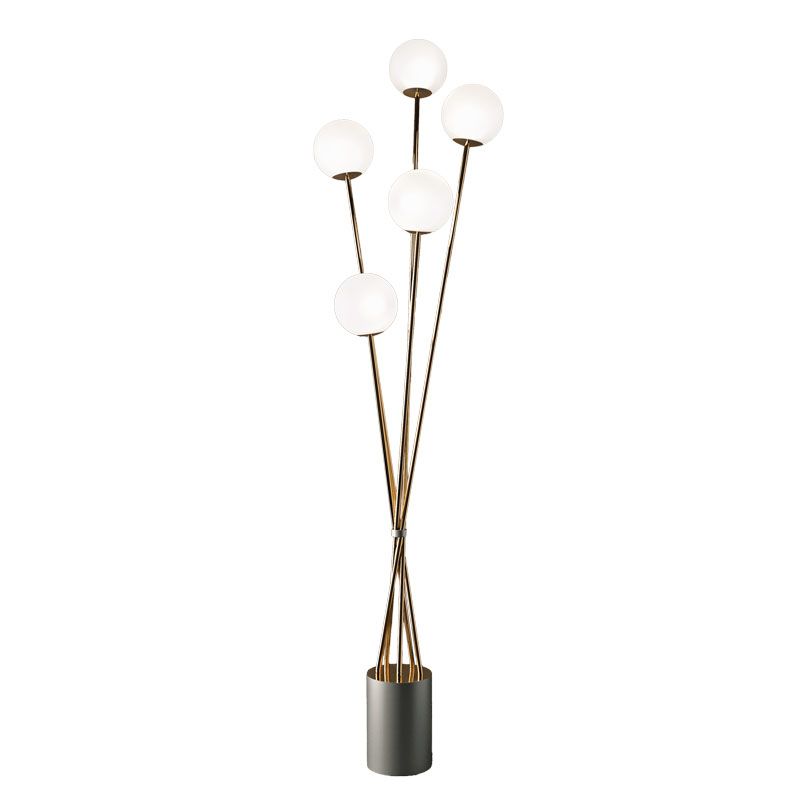 На концах стеблей расположены сферические рассеиватели из выдувного матового стекла — идеально сбалансированные по форме и масштабу. Они создают мягкое, равномерное освещение, наполняя пространство тёплой и уютной атмосферой.