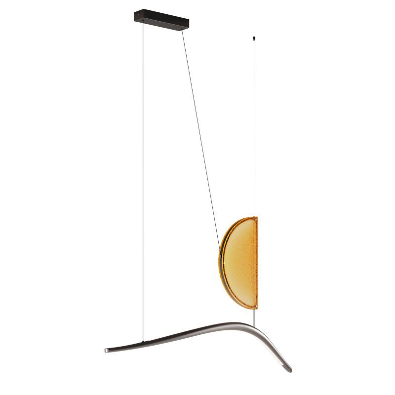 Мягко изогнутый рассеиватель из художественного стекла в тёплых янтарных или глубоких коричневых оттенках словно улавливает движение света, создавая атмосферу уюта и глубины. Контраст с глянцевой тёмно-серой металлической рамой придаёт композиции графичность и современный характер.