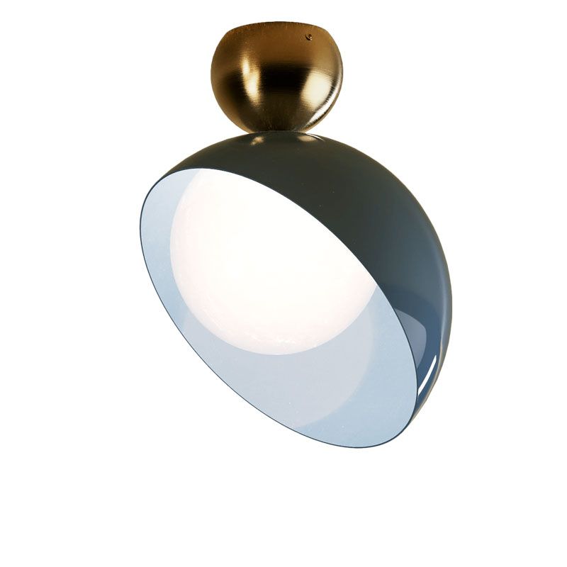 Металлический каркас с декоративными деталями доступен в палитре из пяти оттенков: антично-белый, светло-жёлтый, нежно-голубой, нежно-розовый и капучино. Центральная сфера с матовой отделкой светлого золота добавляет композиции тёплый, благородный акцент, а рассеиватель из белого стекла обеспечивает мягкое, комфортное рассеянное свечение.