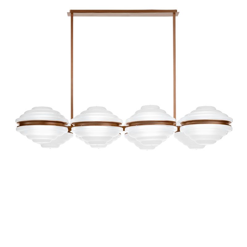 Центральный элемент — геометрическая композиция из металла, где квадратные основания и широкие стойки поддерживают круглые плафоны из матового выдувного стекла. Металлический каркас доступен в бронзе, создающей разное настроение — от тёплого, драгоценного до холодного, графичного.