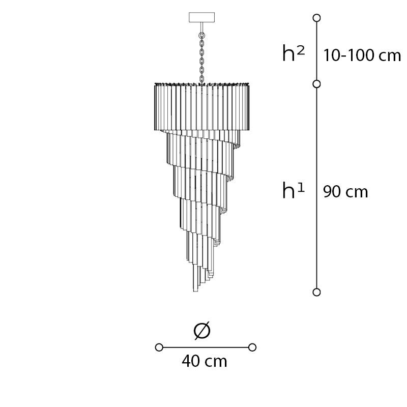 Центральный элемент — завораживающая спираль, собранная из стеклянных триэдров (треугольных призм), которые словно обвивают вертикальную ось светильника. Каждый стеклянный элемент, выдуваемый вручную на муранских мануфактурах, преломляет свет, создавая сложную игру граней и бликов. Прозрачное стекло в сочетании с металлическим каркасом в хромированной отделке рождает ощущение лёгкости и воздушности, несмотря на внушительный масштаб люстры.