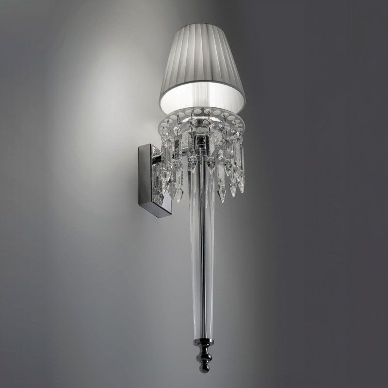 Центральный элемент — трёхуровневая структура из художественного стекла и резного хрусталя, украшенная декором, который словно распускается от источника света, передавая ощущение жизни и полноты. Извилистые линии множатся каскадом, поддерживая современные абажуры из плиссированной ткани цвета айвори. Металлический каркас выполнен в хромированной отделке, а соединительный элемент между ярусами (деталь в виде крюка) имеет благородное покрытие из сатинированного золота, доминирующее над изделием и подчёркивающее его красоту. Маленькие хромированные акценты, напоминающие капли росы, ещё больше обогащают композицию.