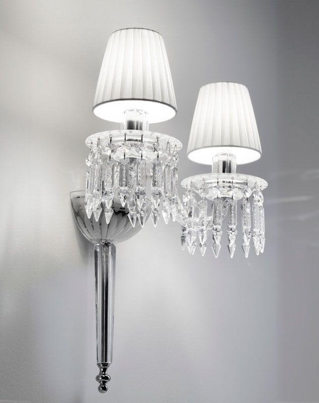Центральный элемент — трёхуровневая структура из художественного стекла и резного хрусталя, украшенная декором, который словно распускается от источника света, передавая ощущение жизни и полноты. Извилистые линии множатся каскадом, поддерживая современные абажуры из плиссированной ткани цвета айвори. Металлический каркас выполнен в хромированной отделке, а соединительный элемент между ярусами (деталь в виде крюка) имеет благородное покрытие из сатинированного золота, доминирующее над изделием и подчёркивающее его красоту. Маленькие хромированные акценты, напоминающие капли росы, ещё больше обогащают композицию.