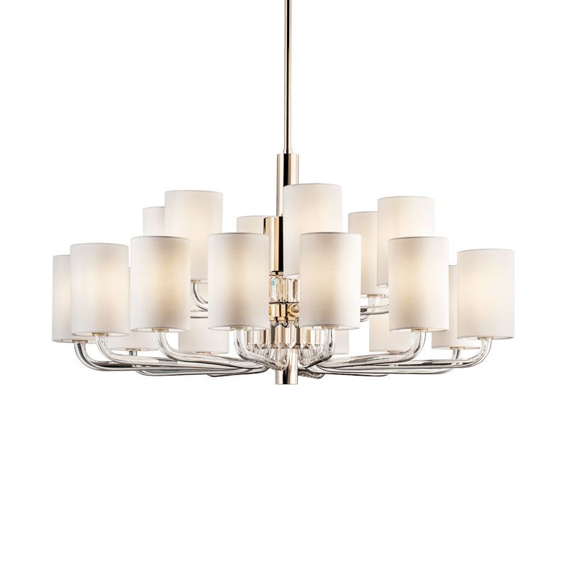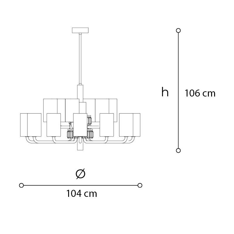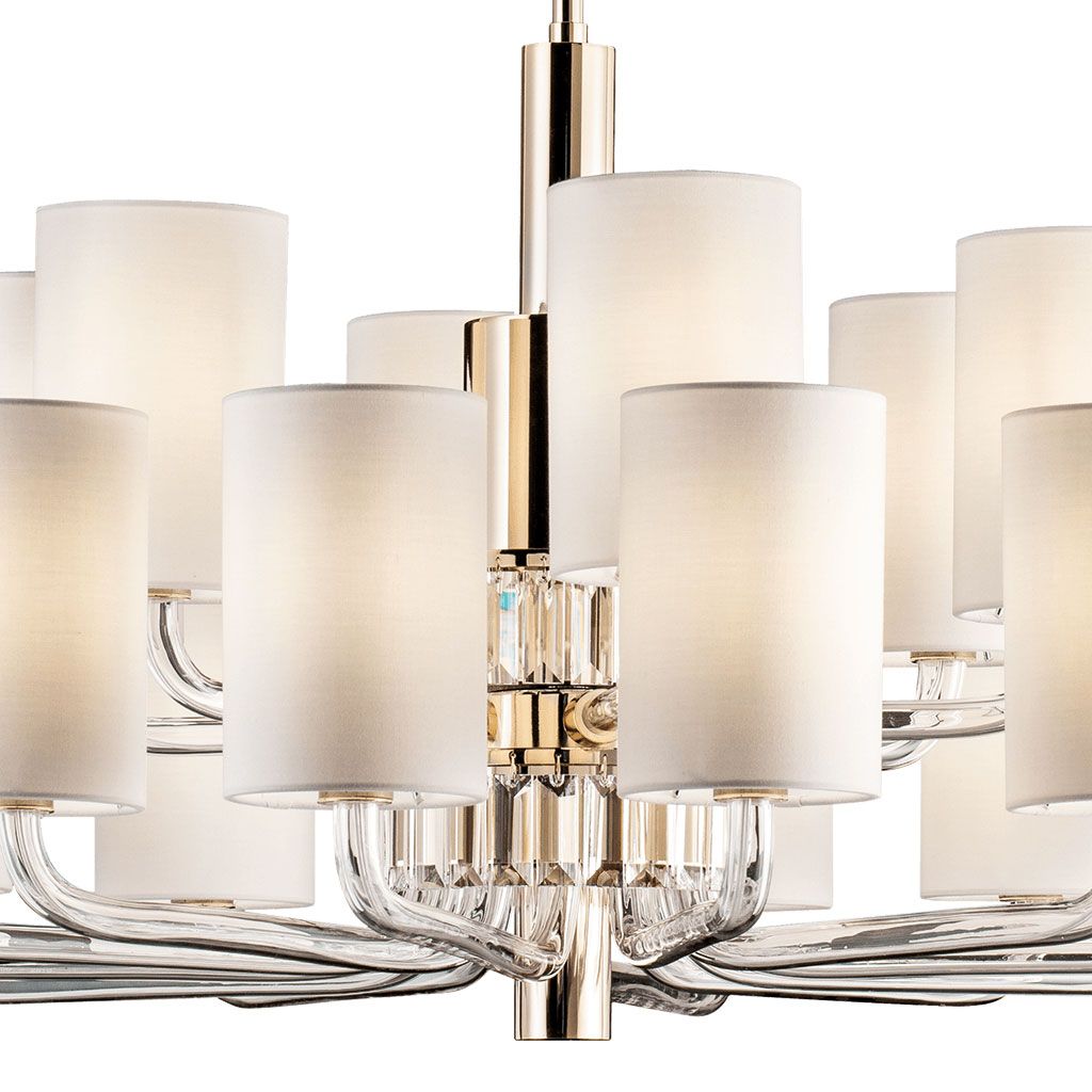 Центральный элемент — ярусная пирамидальная структура, где прозрачные стеклянные «ветви» расходятся от центральной оси, поддерживая тканевые абажуры оттенка песочный хлопок. Каждый ярус обрамлён изящными хрустальными подвесками, которые, словно драгоценные капли, преломляют свет, создавая сложную игру бликов и теней.