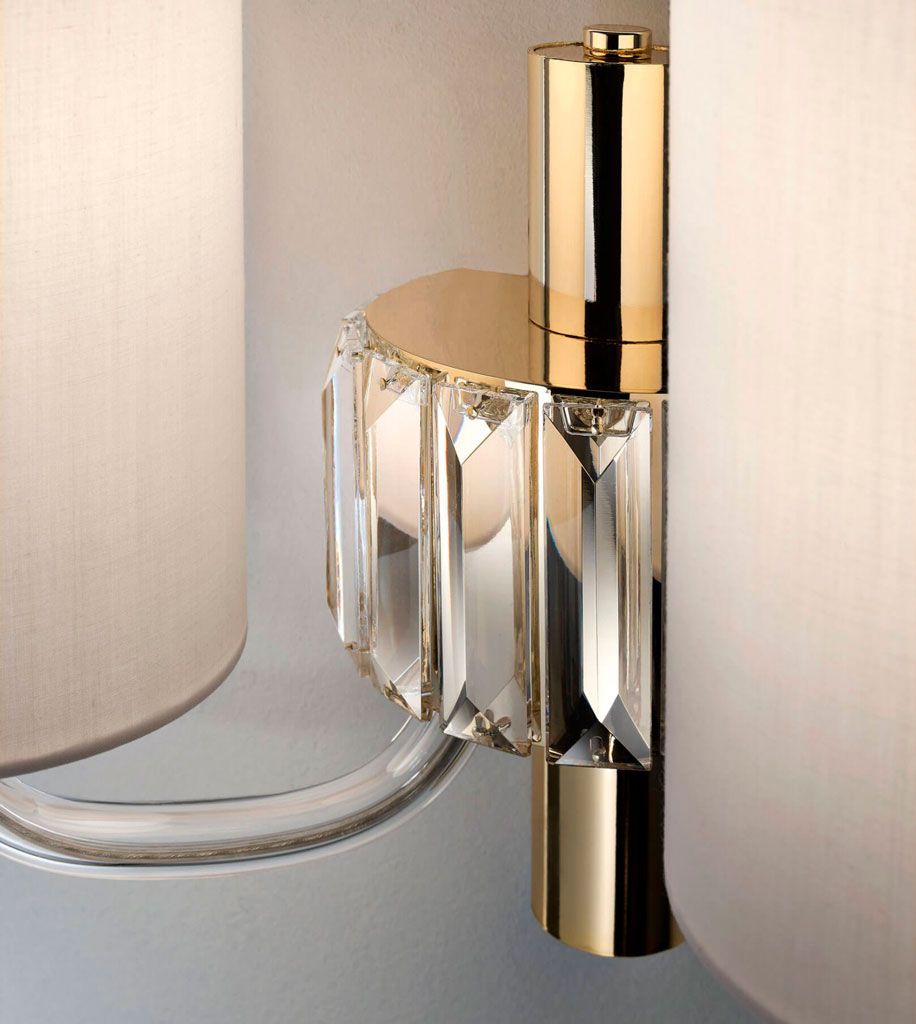 Центральный элемент — ярусная пирамидальная структура, где прозрачные стеклянные «ветви» расходятся от центральной оси, поддерживая тканевые абажуры оттенка песочный хлопок. Каждый ярус обрамлён изящными хрустальными подвесками, которые, словно драгоценные капли, преломляют свет, создавая сложную игру бликов и теней.