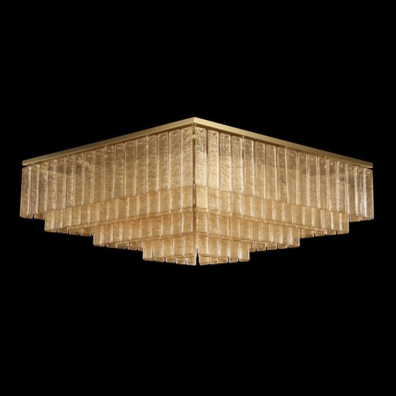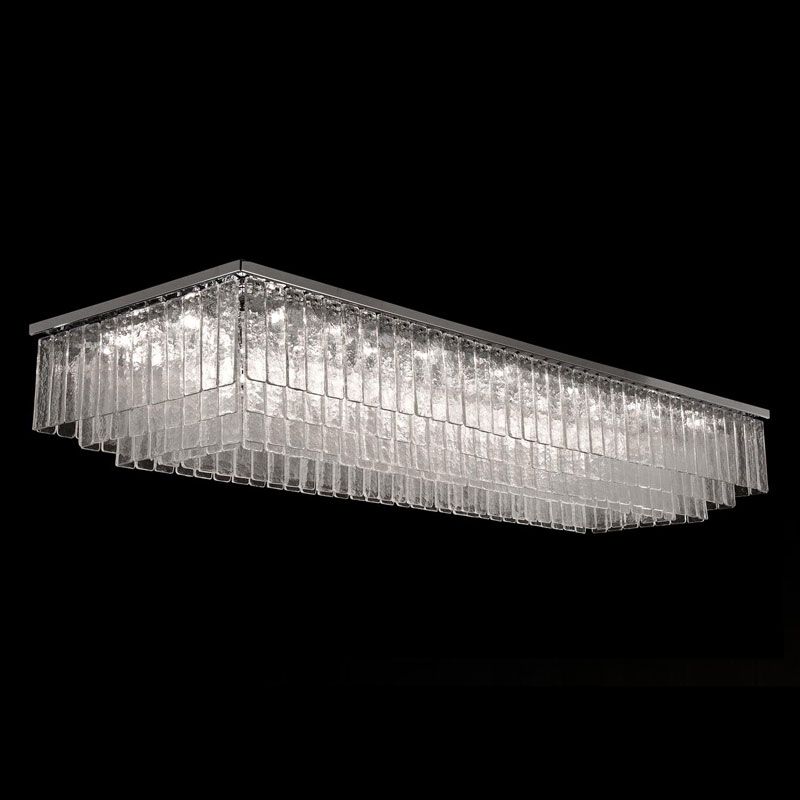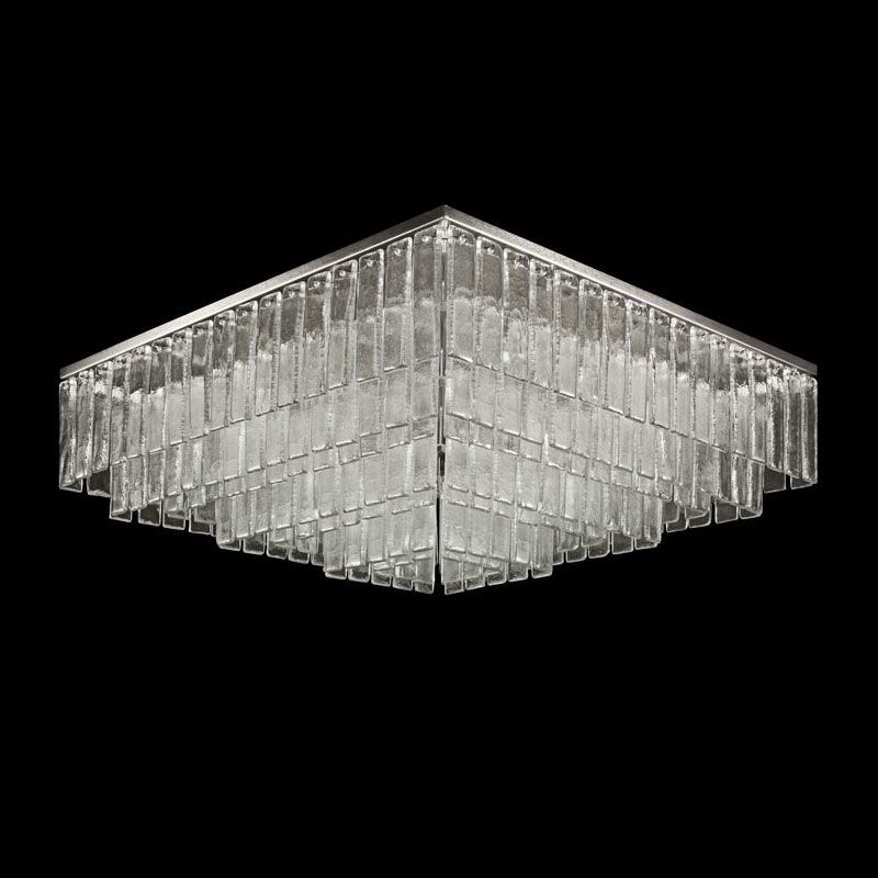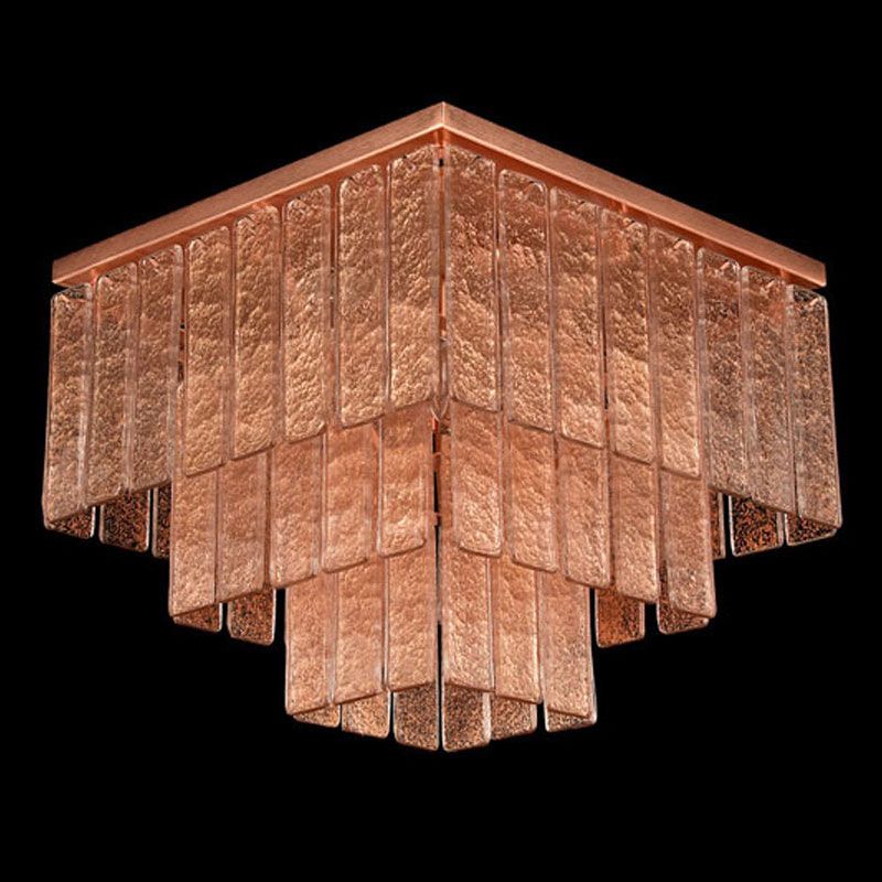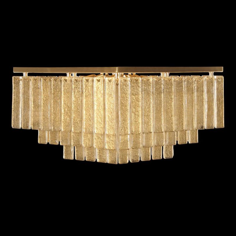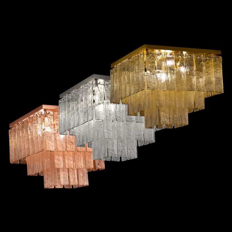 Главный акцент сделан на материале — тонких пластинах из муранского стекла, выполненных по специальной технологии. Их поверхность обладает уникальной фактурой, благодаря которой свет преломляется и создаёт мягкую, многослойную игру бликов.