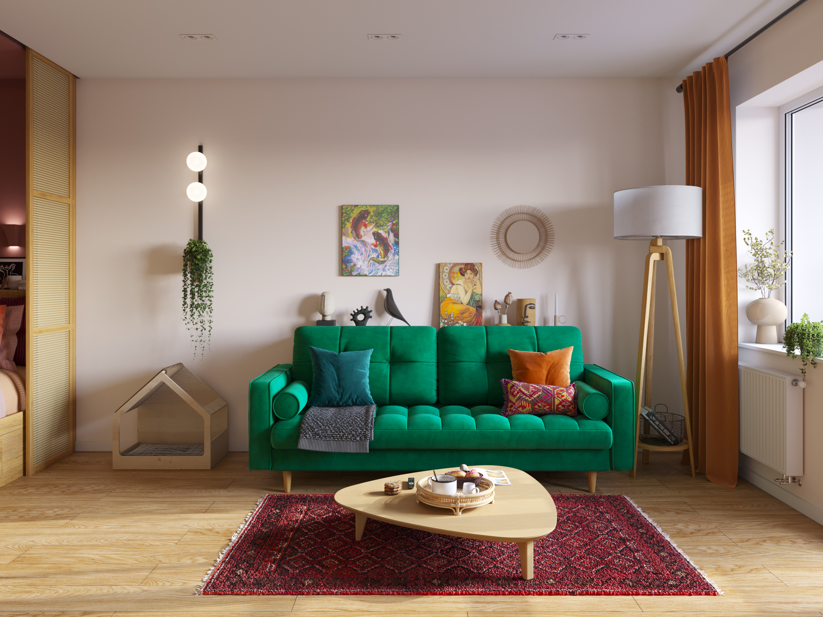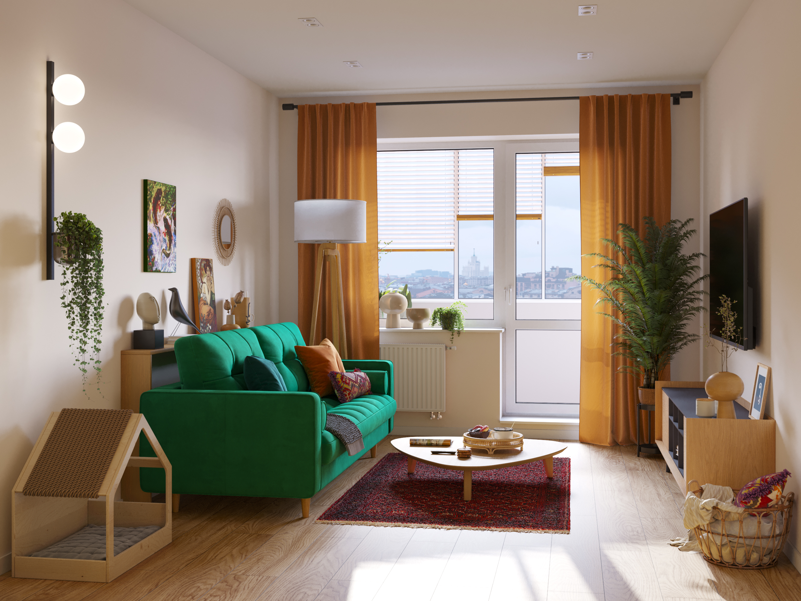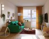 Дизайн-проект однокомнатной квартиры в Москве в доме серии II-67 для молодой девушки. Квартира в скадинавском бохо стиле. В интерьере использована пастельная природная гамма, а также много ярких акцентов. Несмотря на небольшую площадь, в квартире много мест для хранения: гардеробная комната, выдвижные ящики под кроватью, шкаф в прихожей в нише. Не забыли и о питомце. Для кошки были предусмотрены лоток, интегрированный в тумбу в ванной, миски с кормом и водой в кухонном модуле, домик-когтеточка в гостиной.
