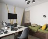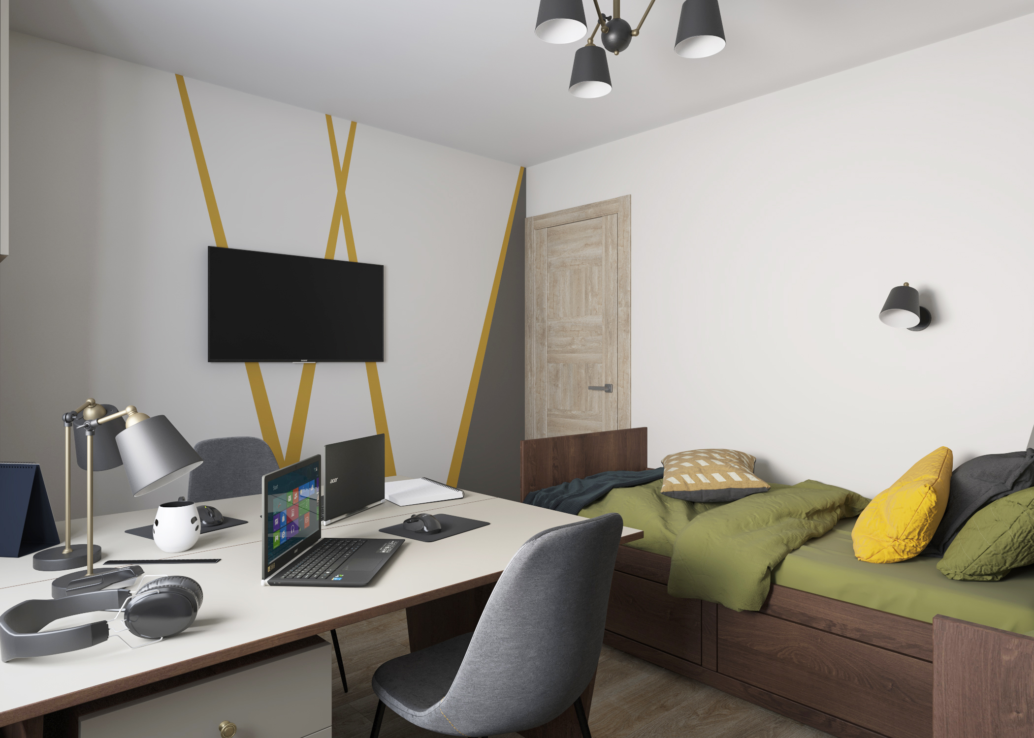 Проект был создан для семьи, где 2 мальчика-подростка, которым уже не нужна двухуровневая кровать, а вот 2 рабочих места обязательно и еще места хранения одежды, учебников и костюмов для танцев. Мальчики, оба занимаются бальными танцами. Комната маленькая, но нам удалось учесть все пожелания и разместить все необходимое. Хозяйка любит зеленый цвет, интерьер в эко стиле категорически отвергла. Она любит города, тем более что она с детьми и по своей работе часто бывает в разных городах, поэтому идея интерьера в каждом помещении свой город.