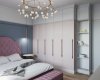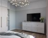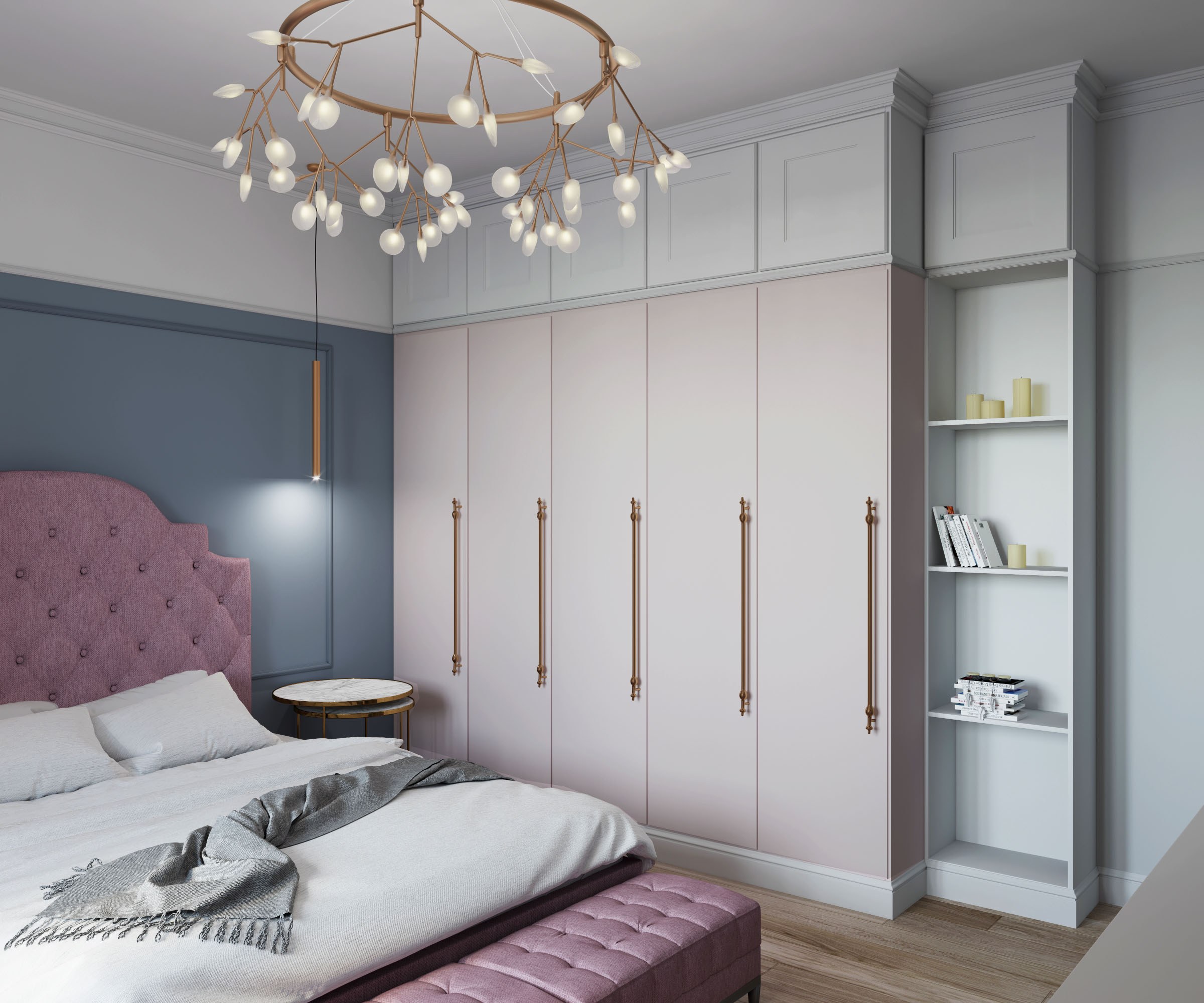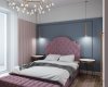 Спальня в светлых оттенках,с мягкими серо-голубыми акцентами. Кровать с мягким изголовьем в каретной стяжке,
