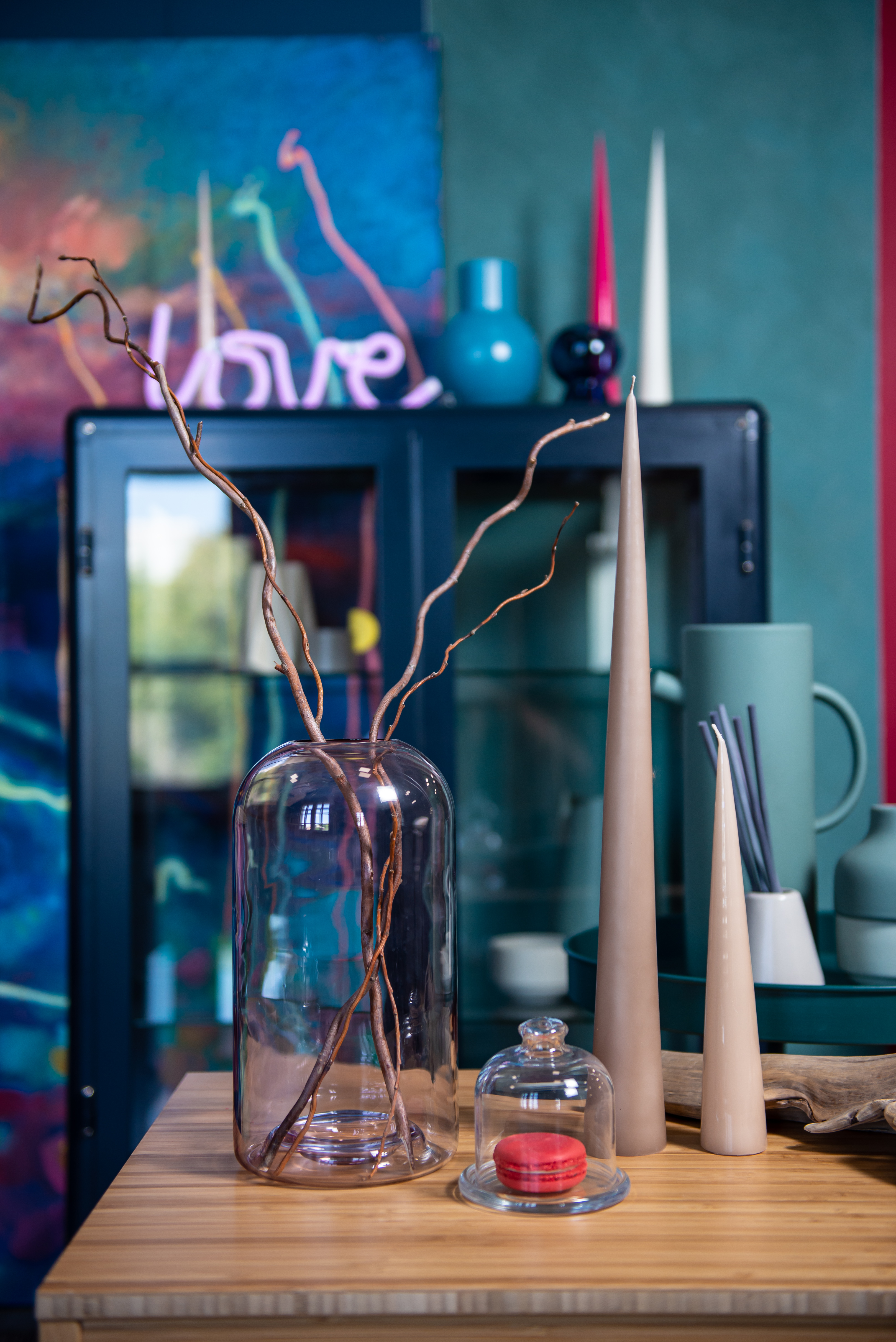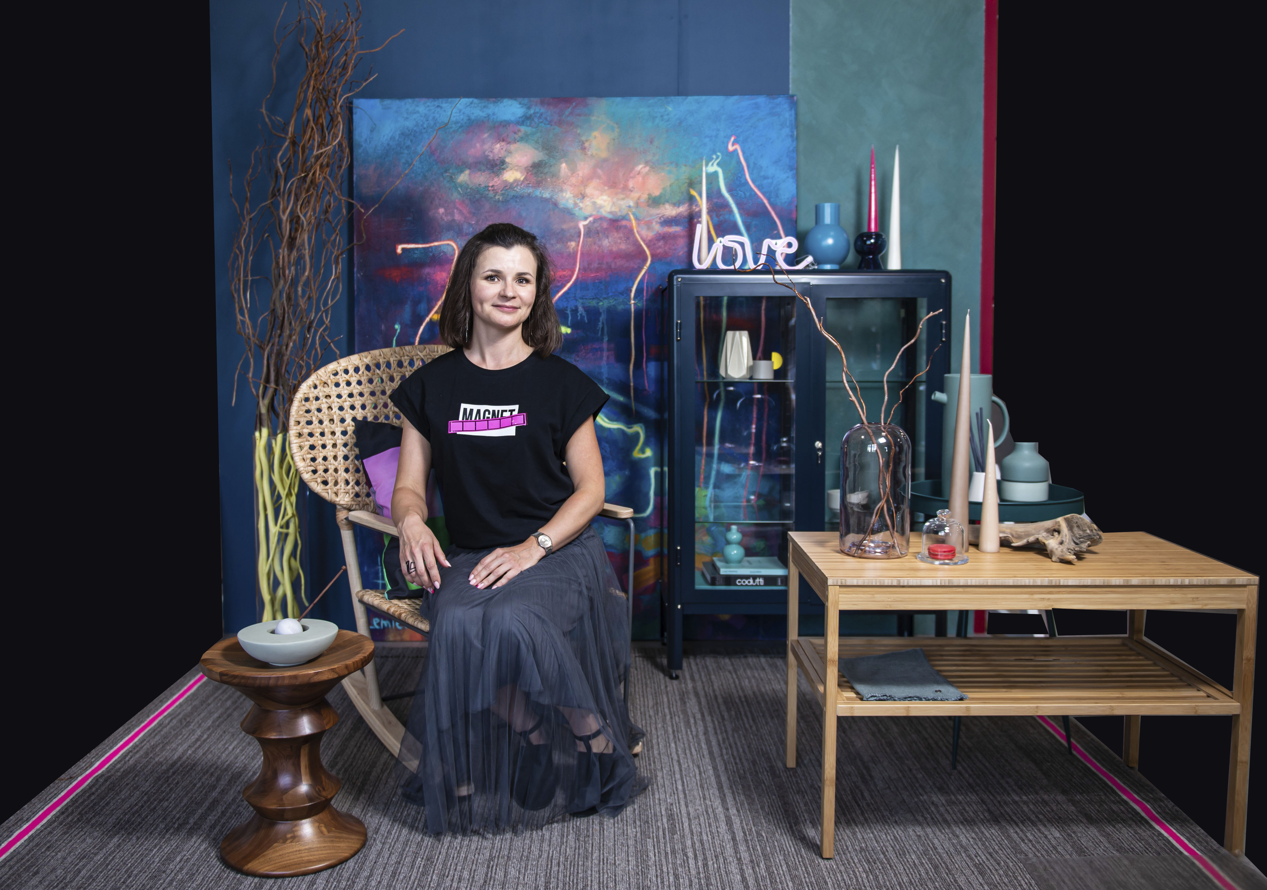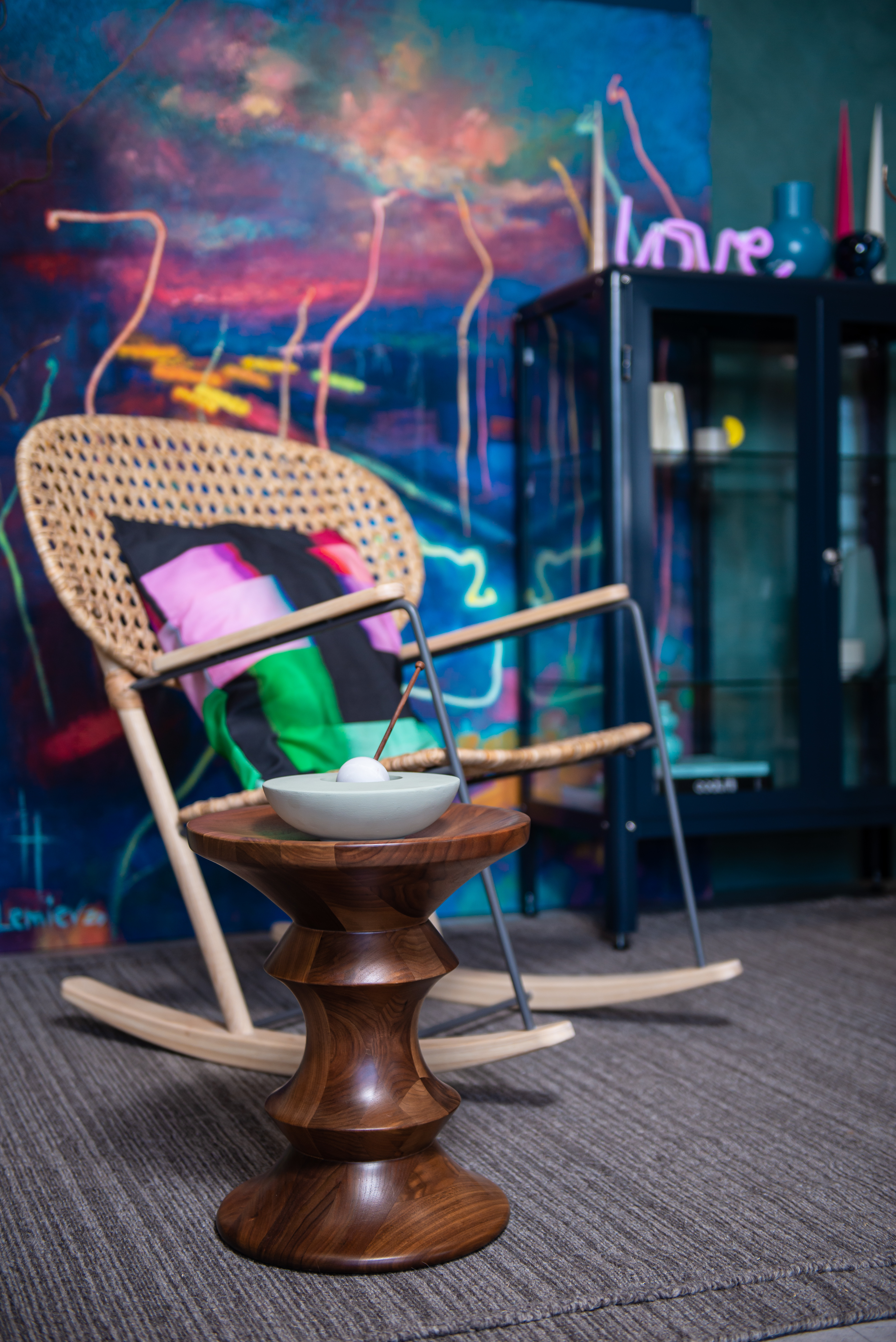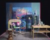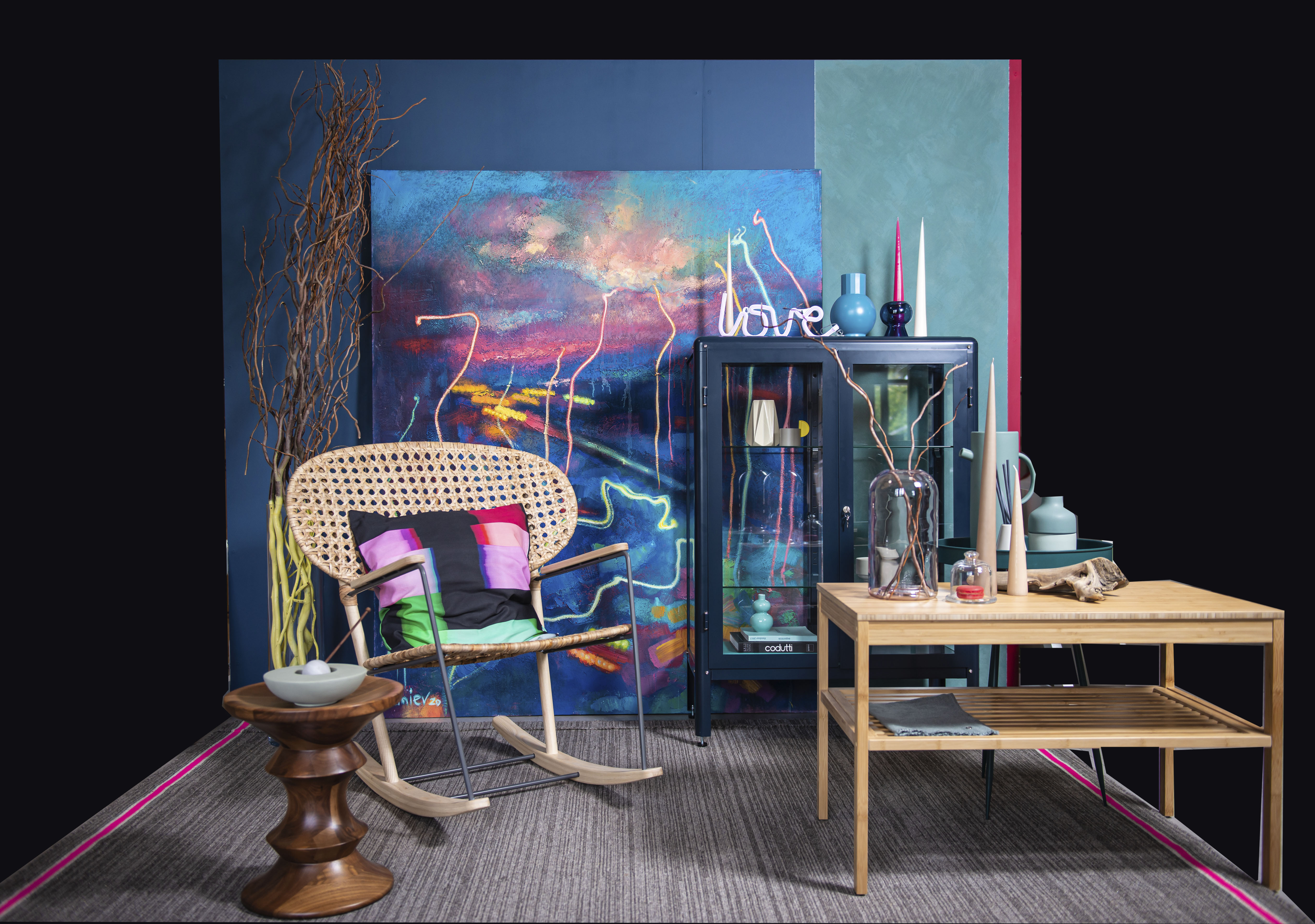 В этой работе, я отразила два пограничных состояния в одном пространстве: это скорость, амбиции, цели, планы, адреналин и замедление, тишина, спокойствие, свежий воздух, простор и свобода – город и природа. Получилось гармонично связать, казалось бы, не совместимые вещи. Вертикальные плоскости на стенде - это "город": синий фон, картина, витрина, переходящие в "природу" - зелёный фон, растекающийся на горизонтальные плоскости через мебель, ковер и предметы декора. Яркие розовые полоски - как дорожная разметка, возвращают нас обратно в город... круговорот... Сегодня я смотрю на эту работу и у меня другие ассоциации: фон - это внешний мир сверкающий громом и молниями, а внутри - это мирок отдельной семьи – кресло-качалка, ароматный чай с макаруном, аромолампа и ветки в вазе, которые вот-вот выпустят листики из почек… «Оазис в эпицентре» - вот новое название моей работы)))
