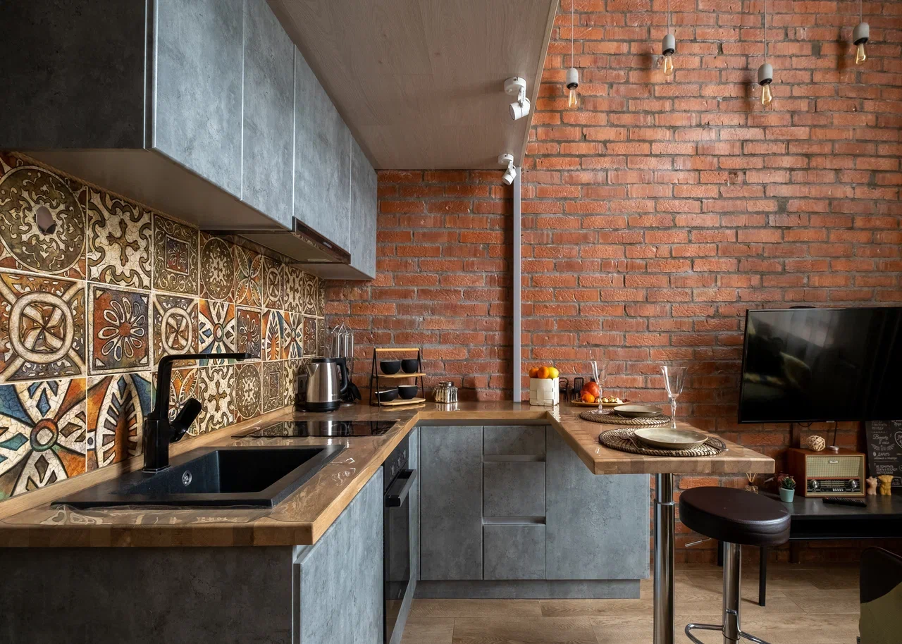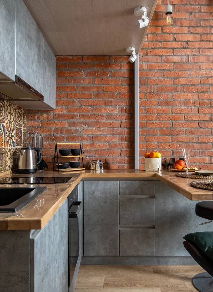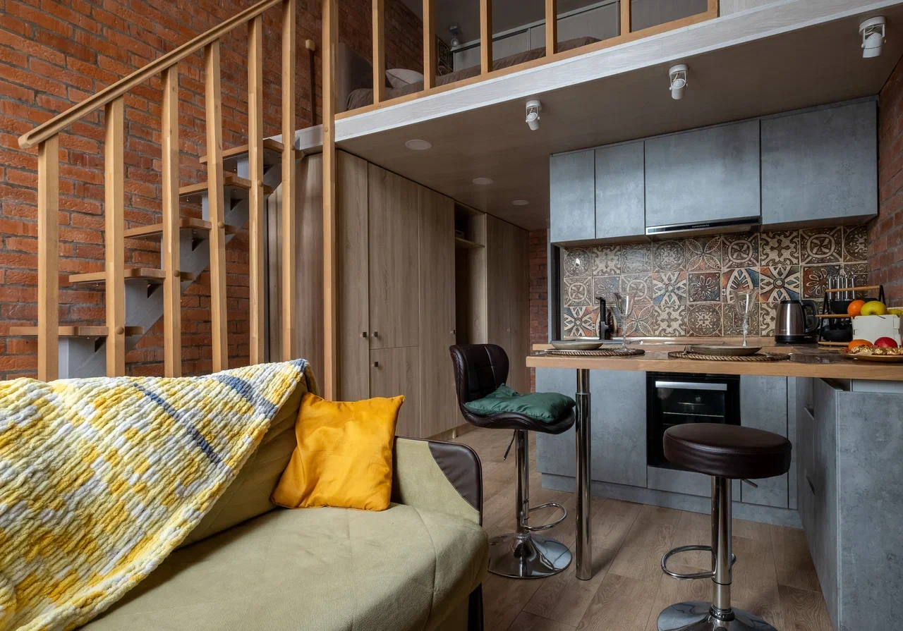 Интерьеры под сдачу в аренду – это отдельная категория в дизайне, но при этом не менее интересная. Здесь важно мыслить более масштабно и стараться угадать, что понравится большому количеству людей. Потому что за-ранее дизайнеру, как и заказчику неизвестно, кто будет проживать в квартире. Безусловно, есть ориентир на количество человек и возможный пол, но интересы и вкусовые качества остаются под вопросом. Под сдачу выполняется универсальный проект, в этом и заключается специфика работы направления. Небольшое помещение, площадью около 30м2 (учитывая второй уровень), сделано в стиле лофт. Стены изначально были кирпичными и мы их решили сохранить. Они идеально вписались в нашу стилистику. Кирпич — это именно та деталь помещения, которая зацепила заказчика при покупке апартаментов. А так же задала общее настроение интерьера помещения. На первом уровне расположена кухня, гостиная и санузел, на втором – спальная зона. Мы использовали разные сценарии освещения для этого проекта. Основным, является люстра необычной формы, выполненная из металла. Над кухонной зоной и гостиной, мы добавили споты с направленным освещением, как дополнительный свет. По двум сторонам от окна, разбавили интерьер необычными бра в виде огнетушителей. На мой взгляд они идеально здесь подходят. Вернёмся к главной детали лофта – кирпичной кладке. Его зачищали от арматуры, от кладочного материала-цемента и покрывали прозрачным лаком. Мебель мы использовали достаточно простую, кухню и прихожую сделали под дерево, а мягкую мебель подобрали в сером цвете. Санузел, в этих апартаментах очень маленького размера. Но тем не менее, мы смогли разместить все необходимое на небольшой площади: душевую кабину, инсталляцию, раковину и под ней стиральную машину. Душевую мы сделали со специальным трапом, в обычных квартирах такой прием делать незаконно, но так как у нас апартаменты, да еще на первом этаже все получилось по правилам! Плитку мы подобрали в двух рисунках — керамогранит под бетон и в стиле пэчворк. Эта квартира получилась очень уютной и стильной. А мое видение, универсального пространства, уверена совпадает с большинством.