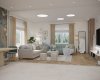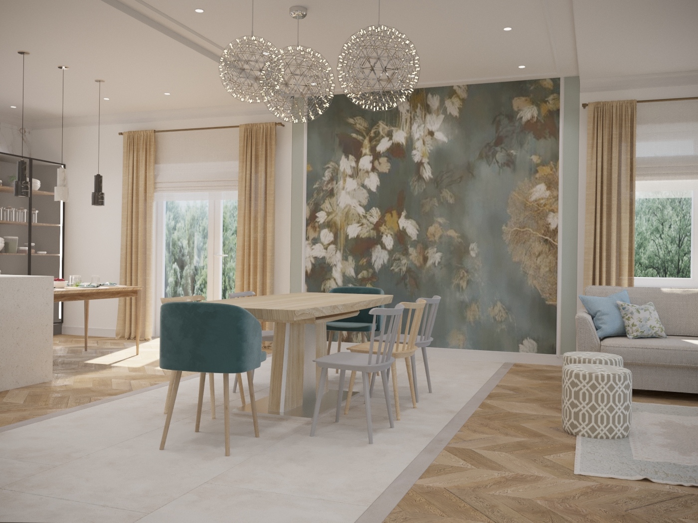 В другой части организовалась комфортная зона гостиной с домашним кинотеатром. Диваны и пуфы размещены буквой П, что располагает к теплой беседе и уютному просмотру кино. Пуфы свободно передвигаются и делают пространство еще более свободным. Зона ТВ оформлена керамогранитом под мрамор, что перекликается с кухней. Рядом выделен вместительный шкаф для книг. Обилие окон наполняет пространство светом, теплом, воздушностью. Это поддержано и в отделке: светлая покраска стен, натуральные оттенки дерева пола и мебели, светлый потолок с лаконичными карнизами. Центральное место в комнате занимает фреска с элементами барельефа глубоких зеленых оттенков. Она встречает нас из холла, придает торжественность помещению, разделяет зону кухни и гостиной.