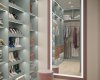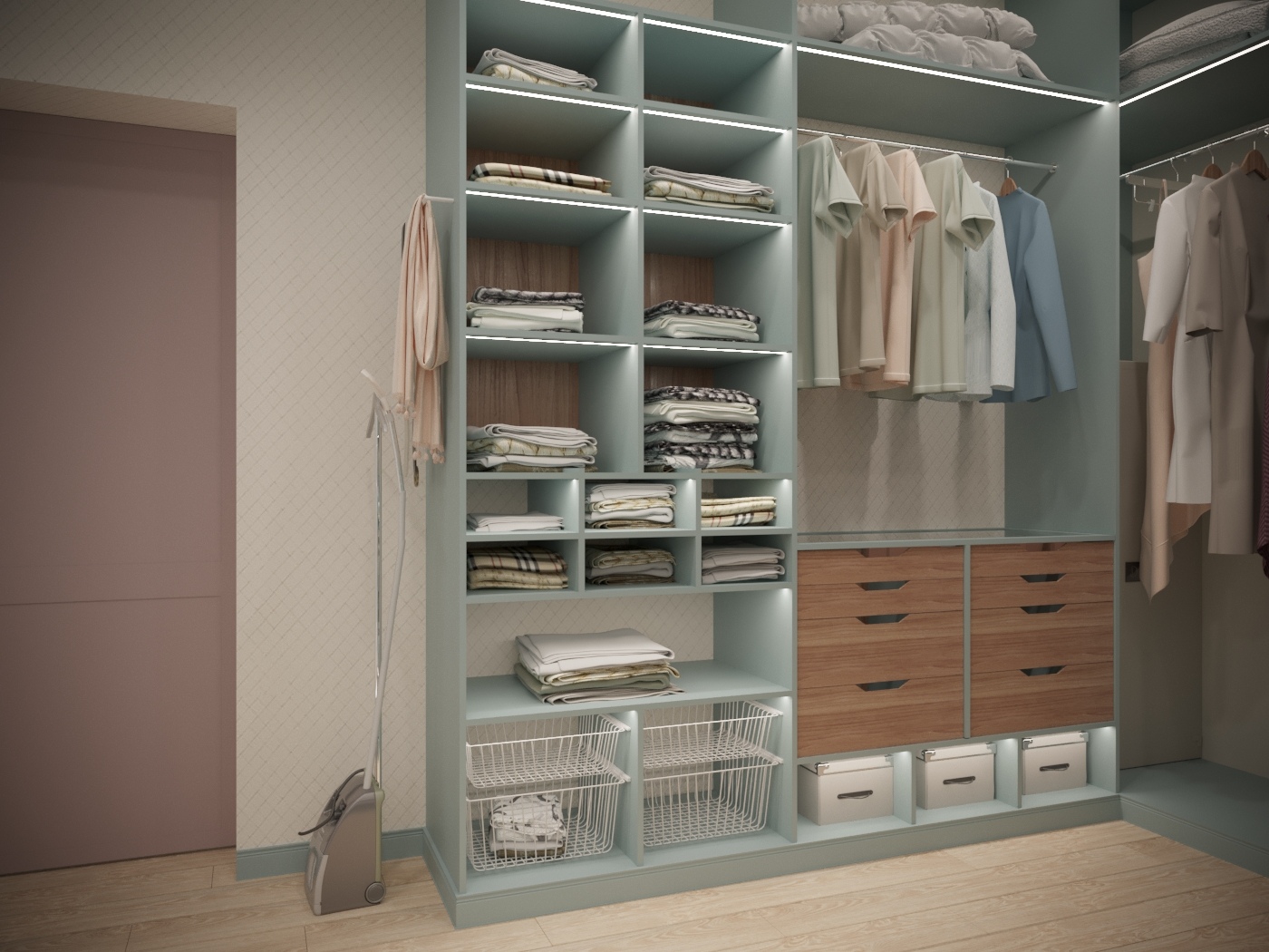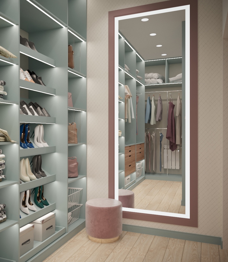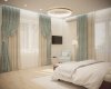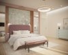 В спальне хозяев выделена отдельная гардеробная комната, но заметить вход в нее будет не так просто. Она располагается за стеной изголовья кровати, которое оформляется мебельными шкафами, за одной дверкой как раз и скрывается вход. В комнате на разных стенах есть два больших окна, наполняющие спальню светом и утренними рассветами. Около изголовья расположились мебельные ниши и бра для чтения. Выделена будуарная зона для хозяйки дома и вместительный комод. Оформление спальни в контрастных оттенках бежевого, пыльно голубого и сиренево-розового. Фреска в изголовье поддерживается текстилем и элементами мебели. В спальне продумано несколько сценариев освещения на разных уровнях: подсветка по периметру потолка, люстра с точками, лампы, торшер, бра. Это позволит создавать неповторимую атмосферу каждый день.