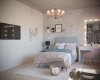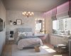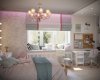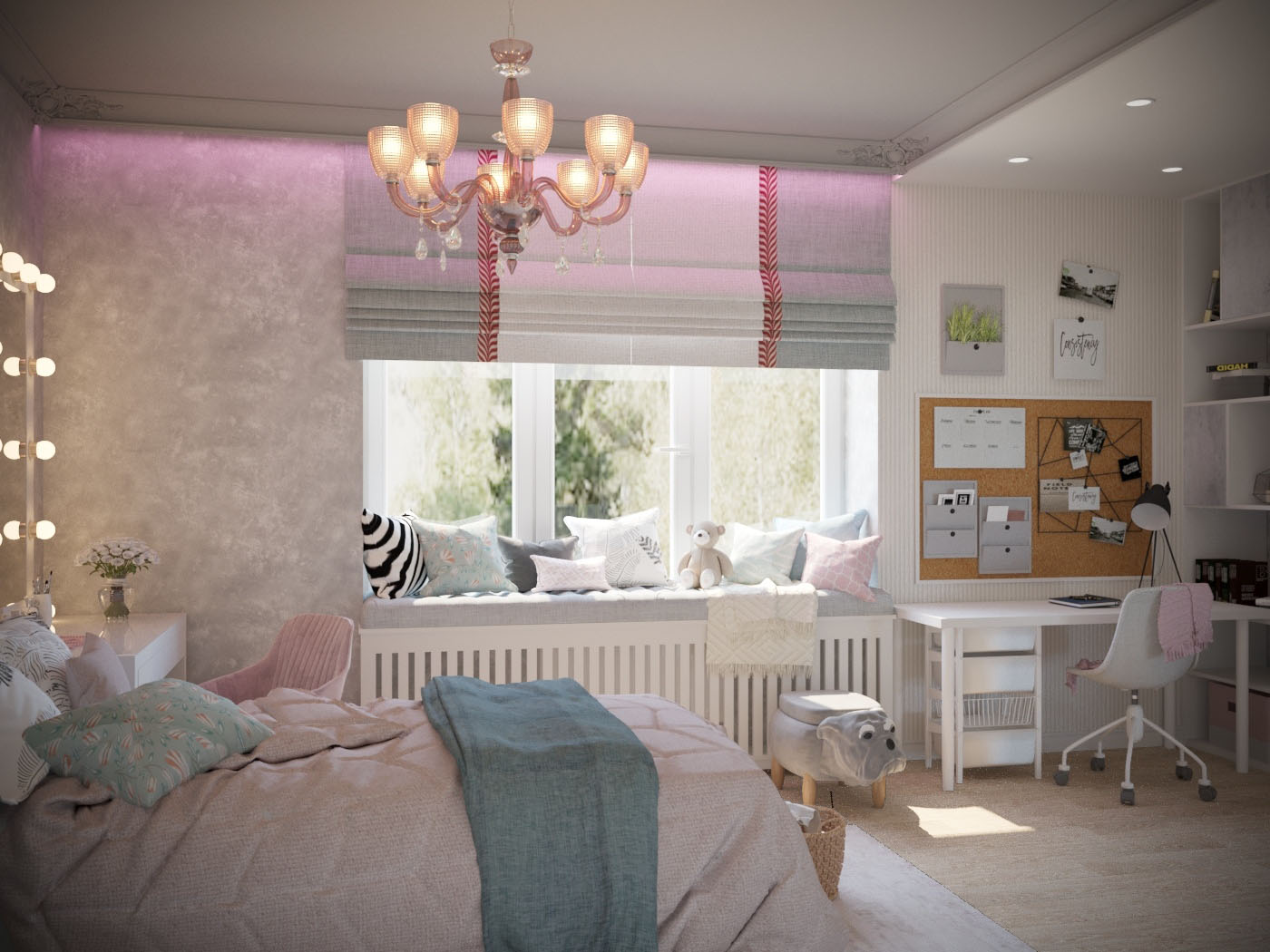Детские комнаты проектировались с учетом возраста, увлечений и характера детей. Комната для старшей дочки- подростка оформлена в светлых, нежных оттенках. Она увлекается творчеством, рисованием, пением, танцами и заполнит комнату яркими элементами. Особым пожеланием было разместить в комнате макияжный столик с зеркалом с лампочками и мягкую зону на окне. Выделены спальная и рабочая зоны. Одну стену занимает стеллаж и шкаф для одежды. Предусмотрено место для напольного зеркала, крючки для украшений, сумок. Над рабочим столом разместилась пробковая доска для различных заметок, рисунков, коллажей. Изысканность комнате придает потолок в спальной зоне, он выделен серым цветом и ажурной лепниной. В нише для штор заложена подсветка, меняющая цвета.