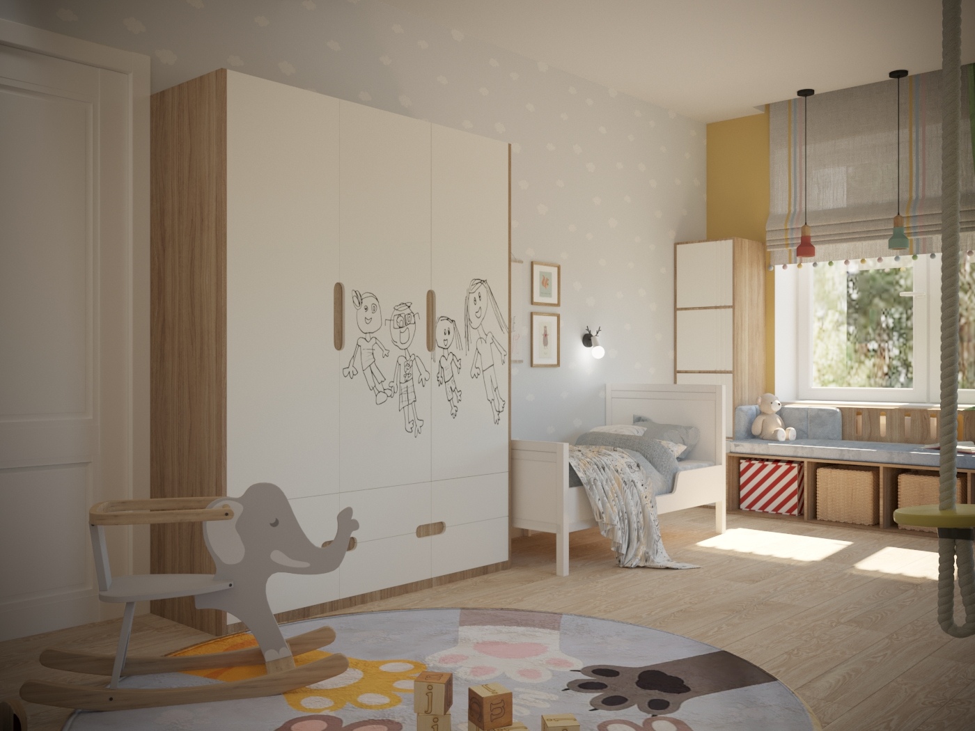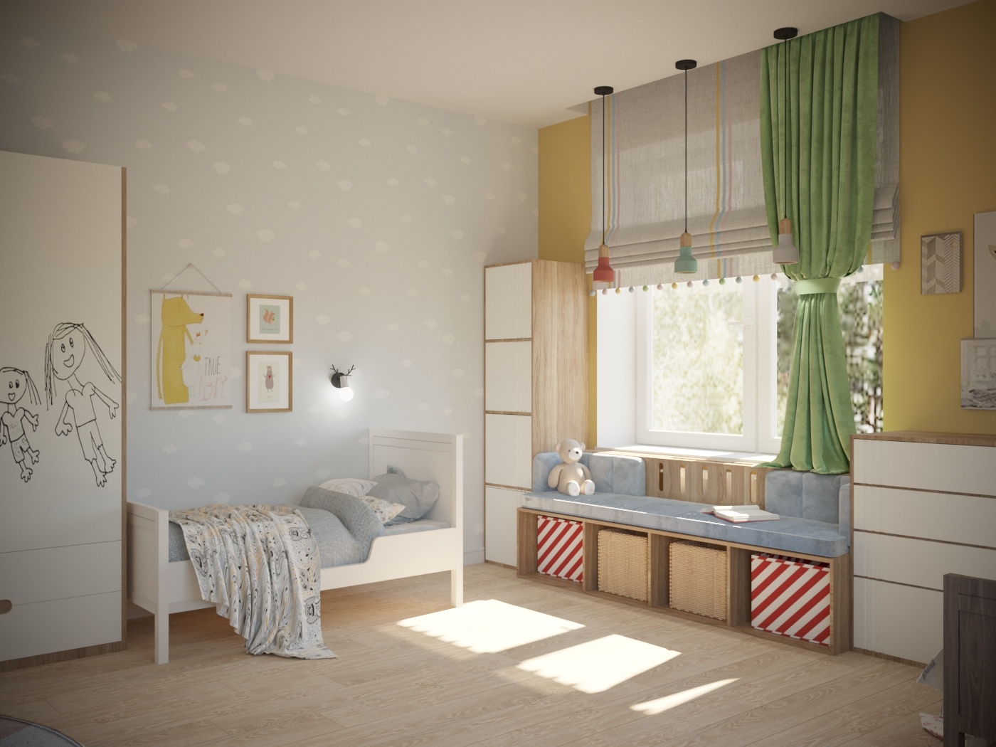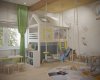 Во второй детской создано пространство для двух малышей: мальчика и девочки. Спальные места разделены. Выделена большая игровая зона. На потолке крепится балка для качелей, каната. Напротив, входа – игровой домик-чердак. На фасадах вместительного шкафа для одежды можно рисовать маркерами и потом стирать. Около одного окна разместился стол для занятий, лепки, рисования. Вдоль второго окна организовался диванчик с хранением игрушек, стеллаж и комод. Диванчик расположен между двумя кроватями, и вечером родители будут приходить и читать сказки. В оформлении детской комнаты использовались натуральные оттенки дерева, яркая покраска и яркие элементы в текстиле и мебели. В игровой зоне всю стену занимает фреска с изображением животных. Облака на фреске и обоях растворяют границы комнаты, позволяя фантазии уноситься в фантастичные миры.