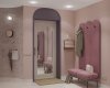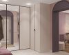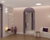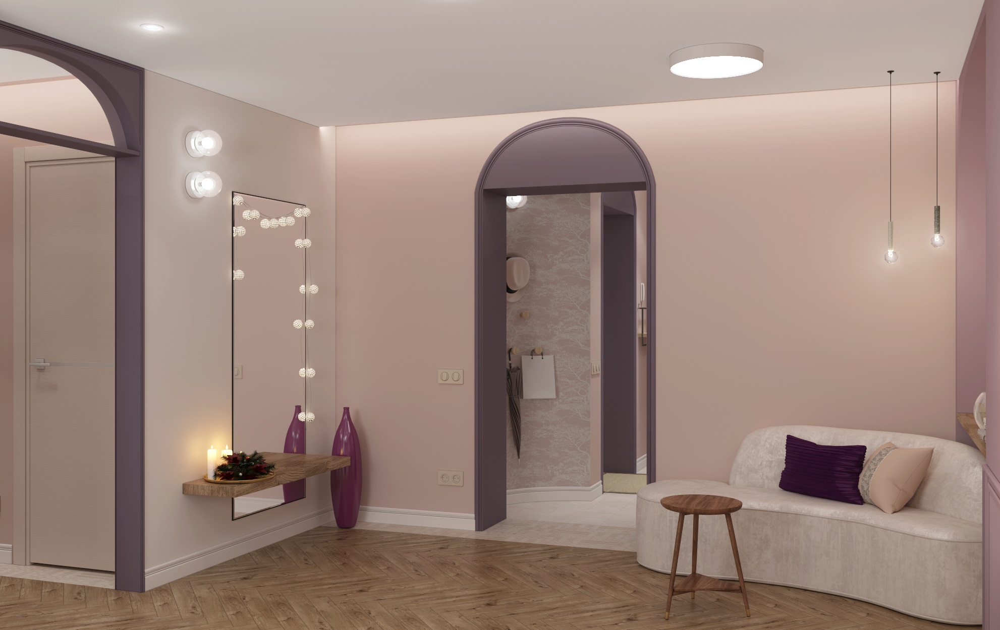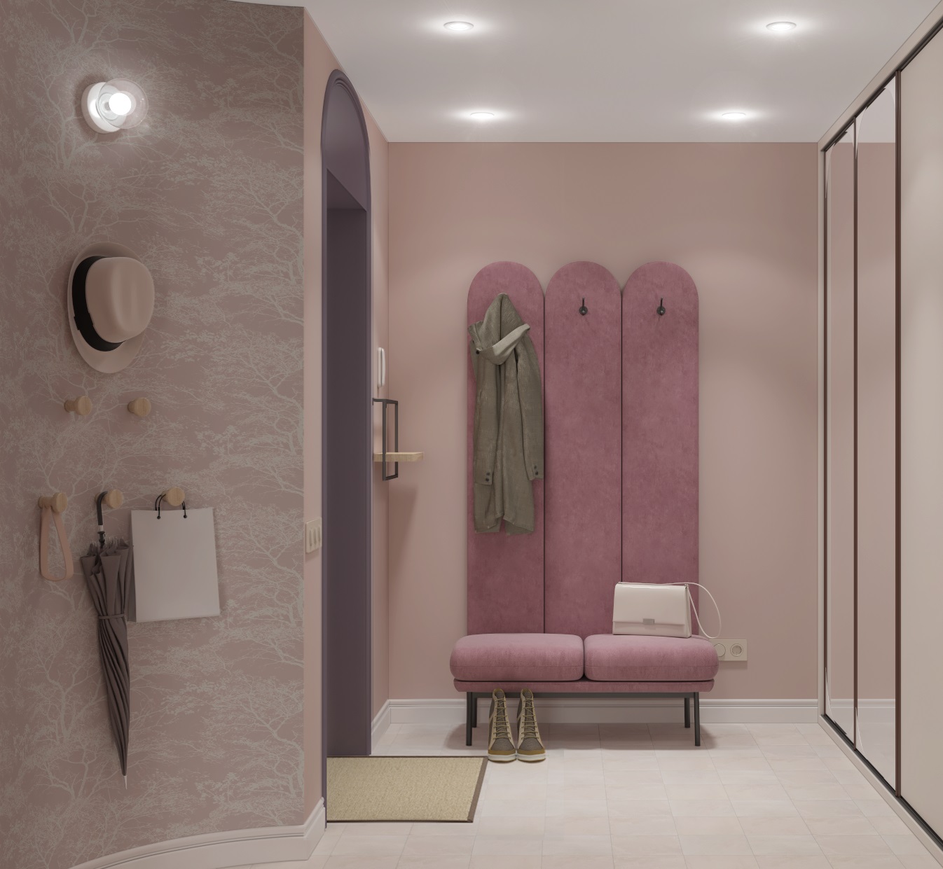 Банкетка с мягкой высокой арочной спинкой встречает при входе, а вместительный шкаф, служит гардеробом для домочадцев. При переходе из прихожей в гостиную справа в нише предусмотрены крючки для хранения сумок, шарфов и головных уборов. Такая система удобна для быстрого доступа к основным аксессуарам необходимым в тот или иной сезон.
