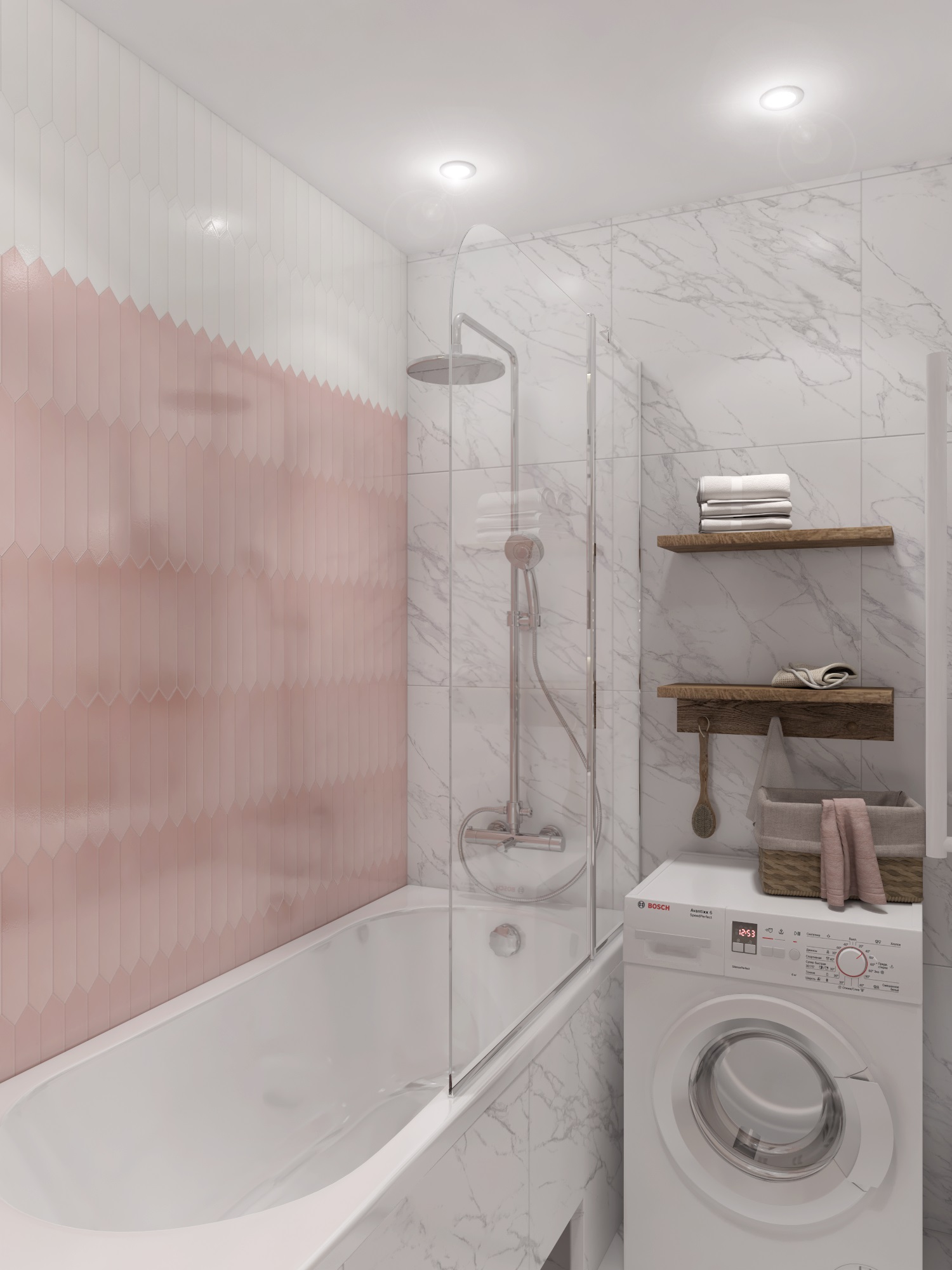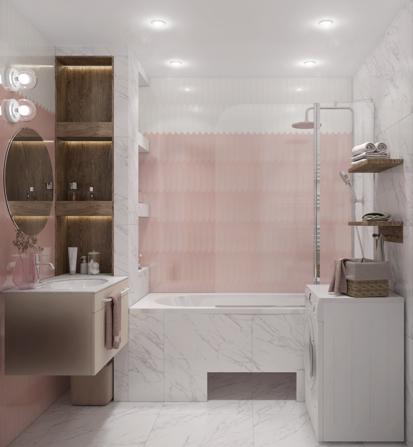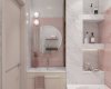 Ванная выдержана в нежных и светлых тонах белой, розовой плитки. Создание короба с нишами для полок позволило функционально разделить комнату на зоны: принятия ванны и умывания. Также в ванной удалось удобно разместить стиральную машинку.