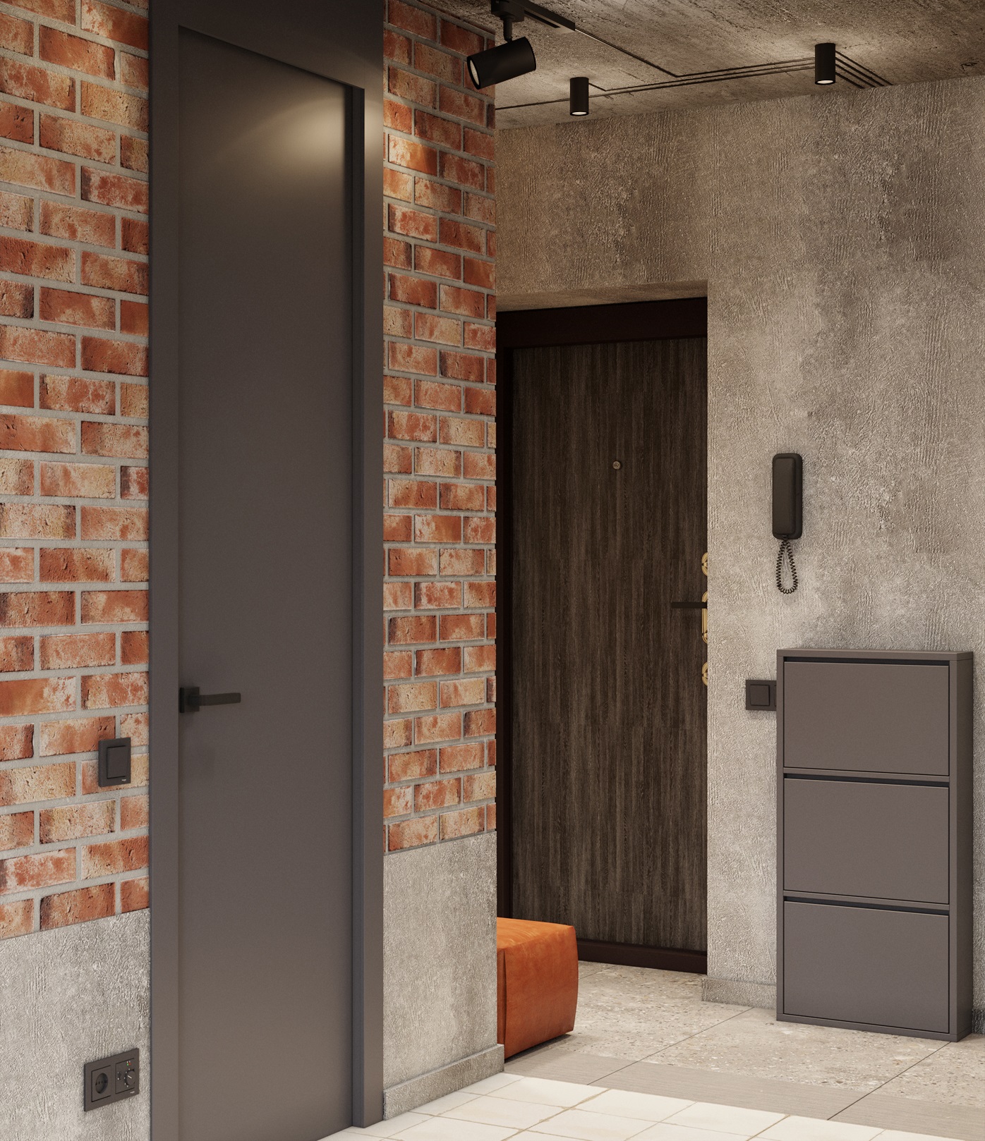Панорамное остекление квартиры, обрамленное в откосы черного цвета, добавляет преимущества квартире, усиливает контраст с основной отделкой квартиры декоративным кирпичом и тем самым создается ощущение «петербуржской квартиры». Трековое освещение на черновом бетонном потолке подчеркивает стиль. Для дополнительной подсветки были добавлены настенные бра, а также декоративный светильник на стене в коридоре. Квартира изначально требовала перепланировки, т.к пожелание заказчика было объединить помещения гостиной и кухни и выделить отдельное помещение для спальни. В ходе разработки планировочного решения нам удалось выделить отдельную спальню с зоной открытого гардероба и получить большое помещение прямоугольной формы кухни-гостиной с панорамными окнами и выходом на лоджию.