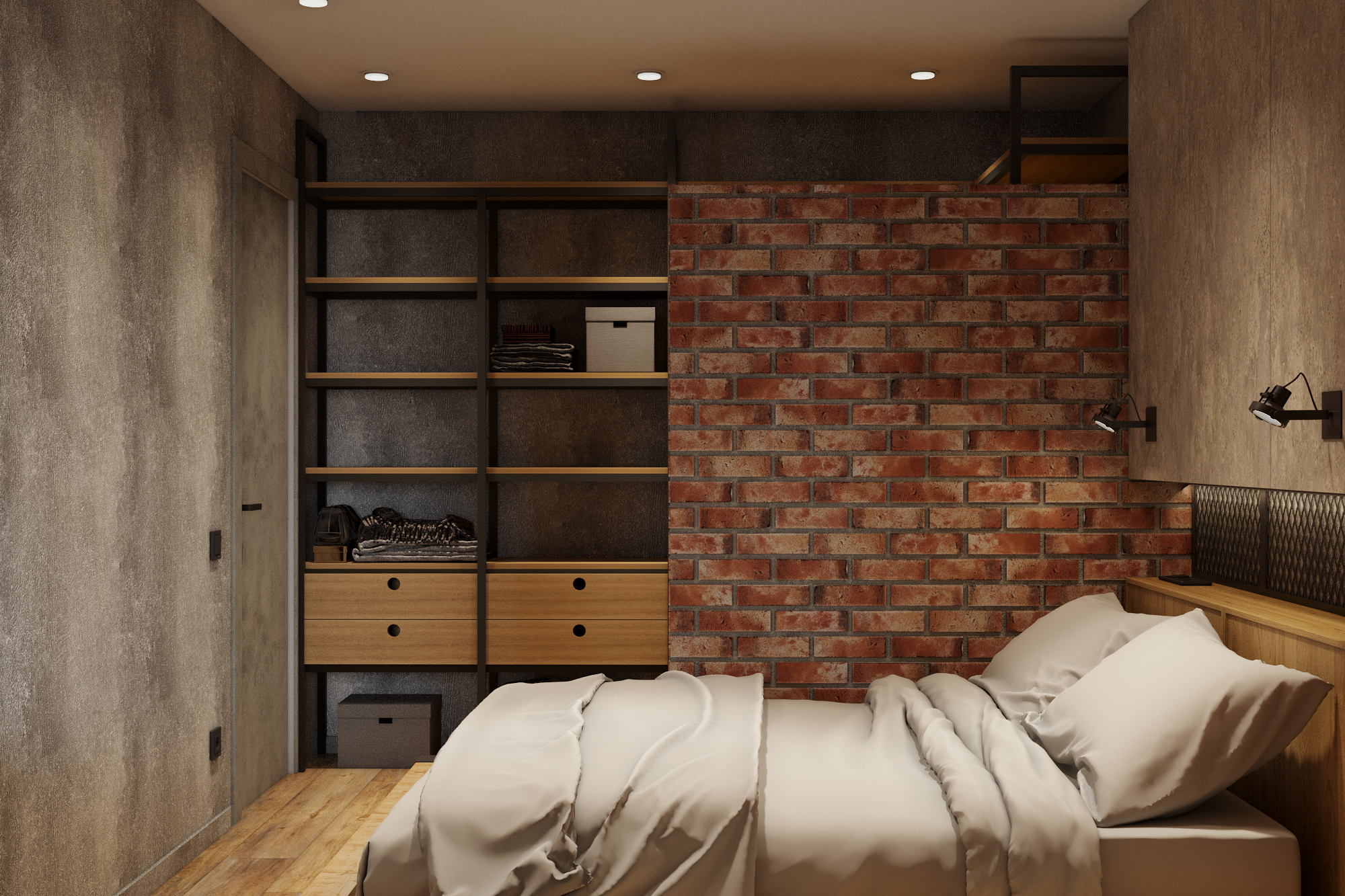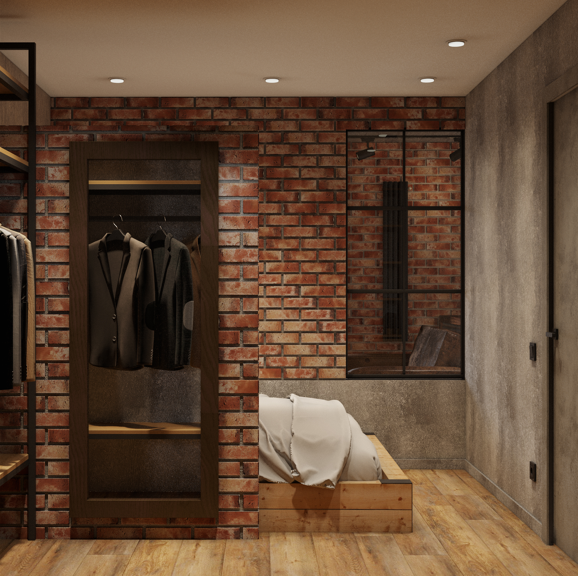 В спальне выполнено визуальное зонирование на пространство с кроватью и гардеробом. Для создания легкости и открытости пространства кирпичную перегородку между пространствами спальни сделали ниже высоты основных стен квартиры. Зона изголовья оформлена мебельным коробом и подвесным шкафом, создающими нишу с подсветкой. Чтобы запустить дневной свет в помещение спальни решено было установить окно в темной раме, стекло будет пропускать дневной свет в комнату, но со стороны гостиной спальня не будет просматриваться за счет использования зеркального стекла. Гардеробная открытого типа выполнена на черном металлическом каркасе с деревянными полками и ящиками для хранения.