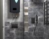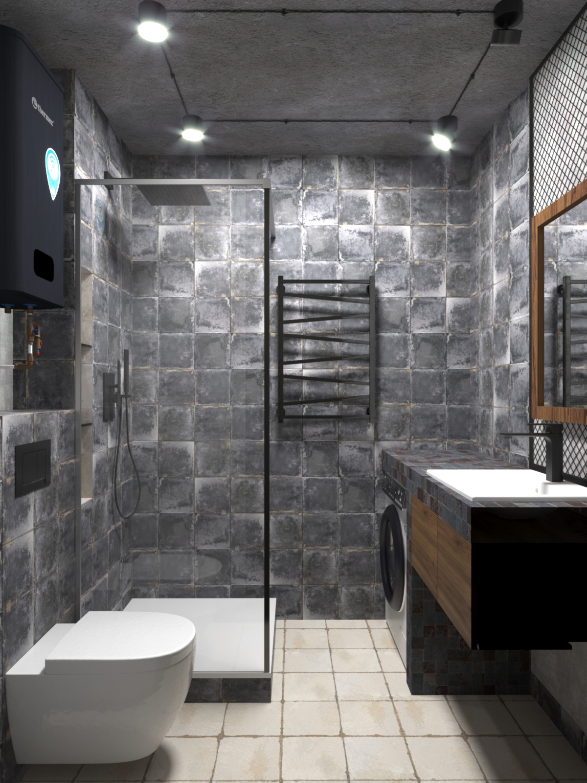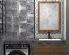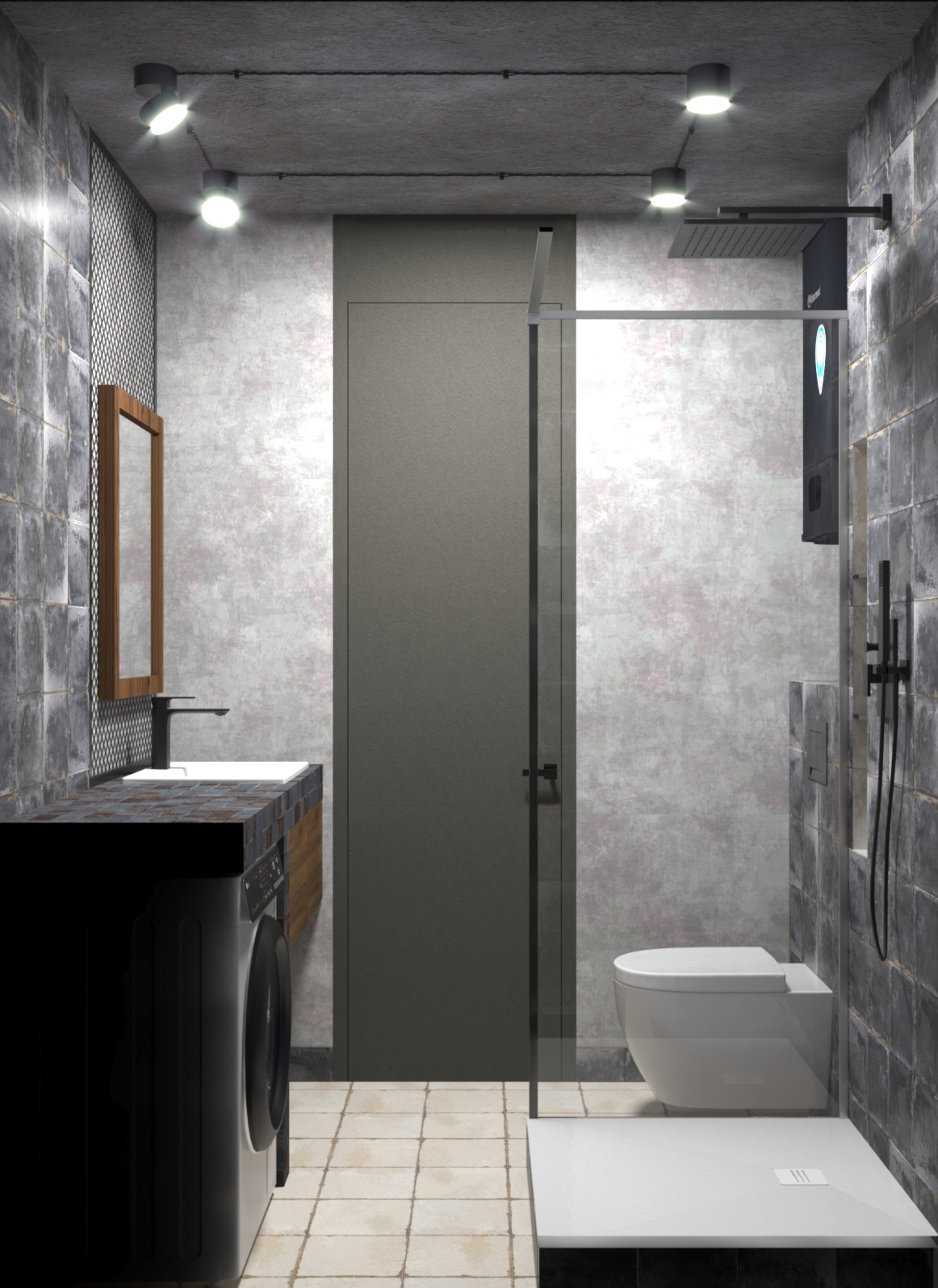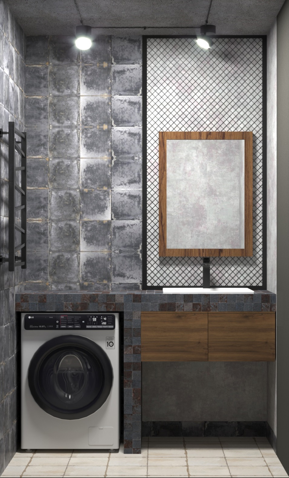 Состаренный эффект серой плитки в сочетании мозаикой создают темное и одновременно лаконичное пространство душевой комнаты. Концепция сочетания темного и светлого поддерживается контрастной сантехникой. Интересное решение конструкции столешницы для встраивания раковины и стиральной машины. Зеркало в деревянной раме и металлическая решетка поддерживают стиль и добавляют грубоватости дизайну.