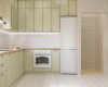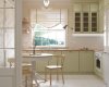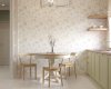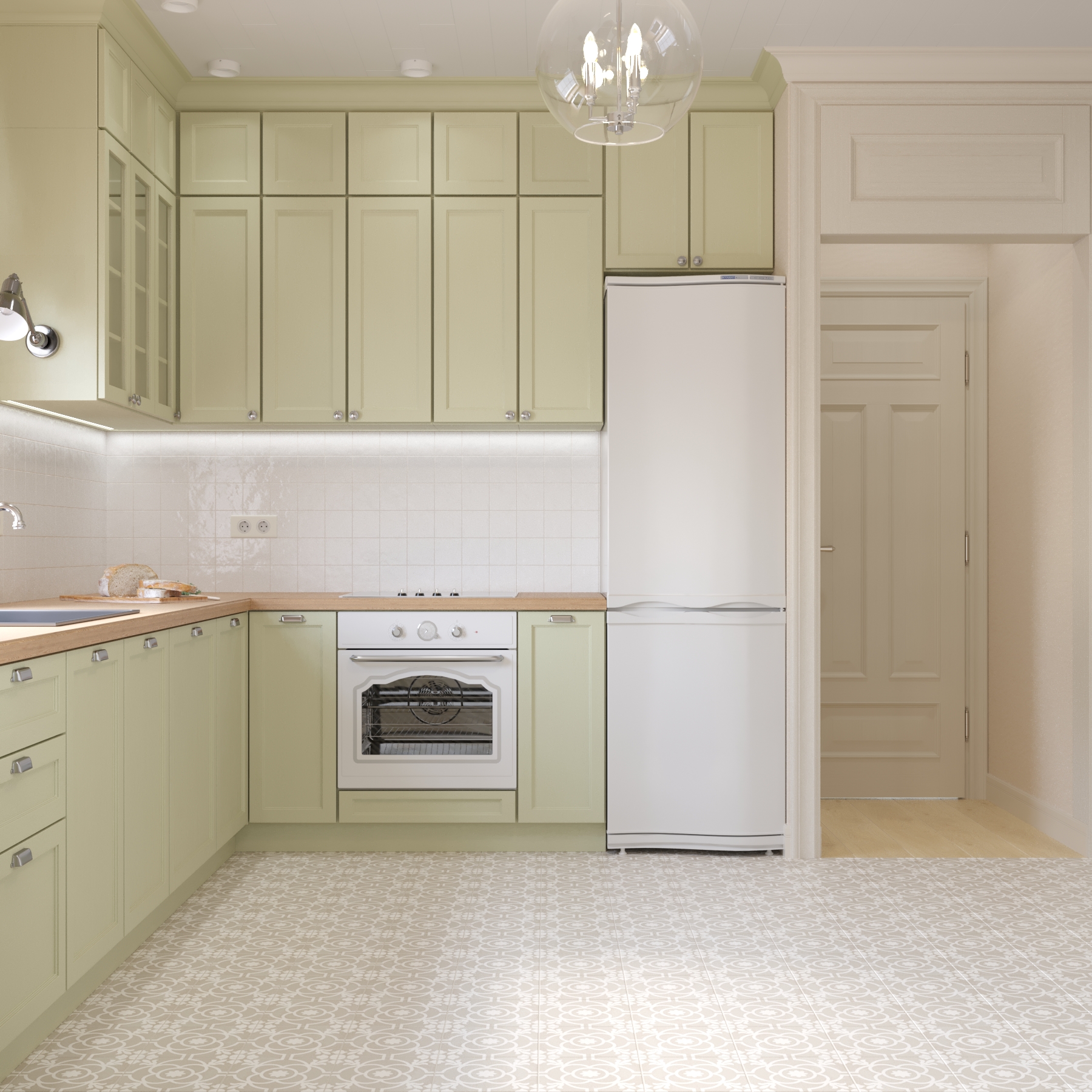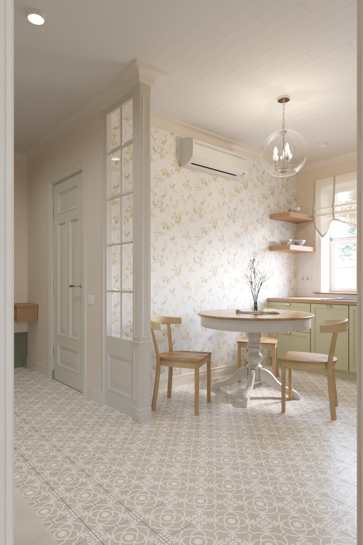 Главное помещение, где за обеденным столом будет собираться вся семья – это кухня. От зоны прихожей ее отделяет мебельная перегородка со стеклом и фацетами. Кухонная мебель организована около окна, оформленного во французском стиле. Идея оформления интерьера дома вдохновлена весной, элементами стиля Прованс. Обои с растительным орнаментом, мягкий оливковый цвет кухни и текстура дерева создают теплую атмосферу. Орнаменты в ажурной плитке на полу перекликаются с веточками в обоях, зеленые невысокие панели и проем у входа в дом добавляют цвета и контрастности пространству.