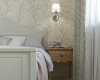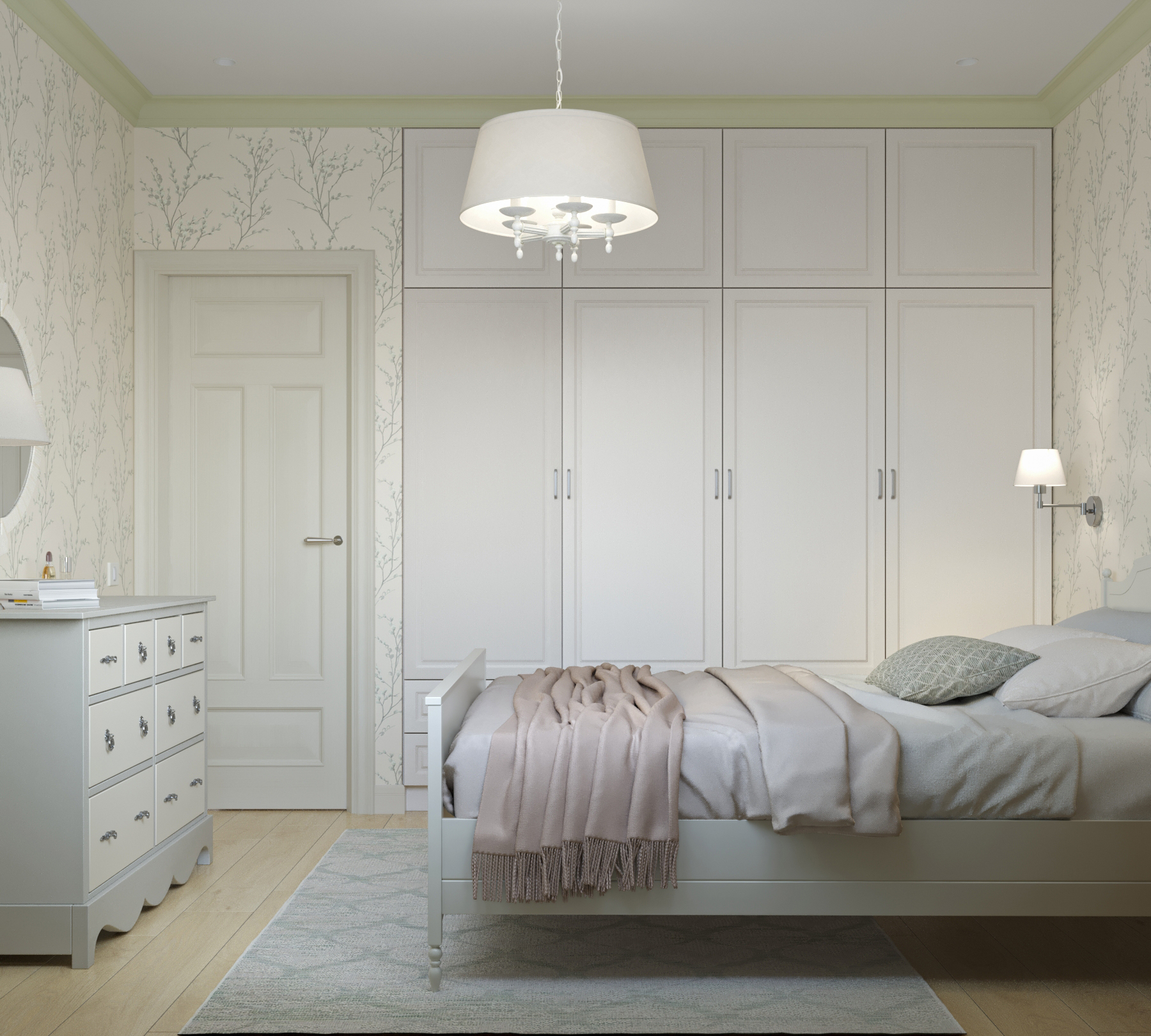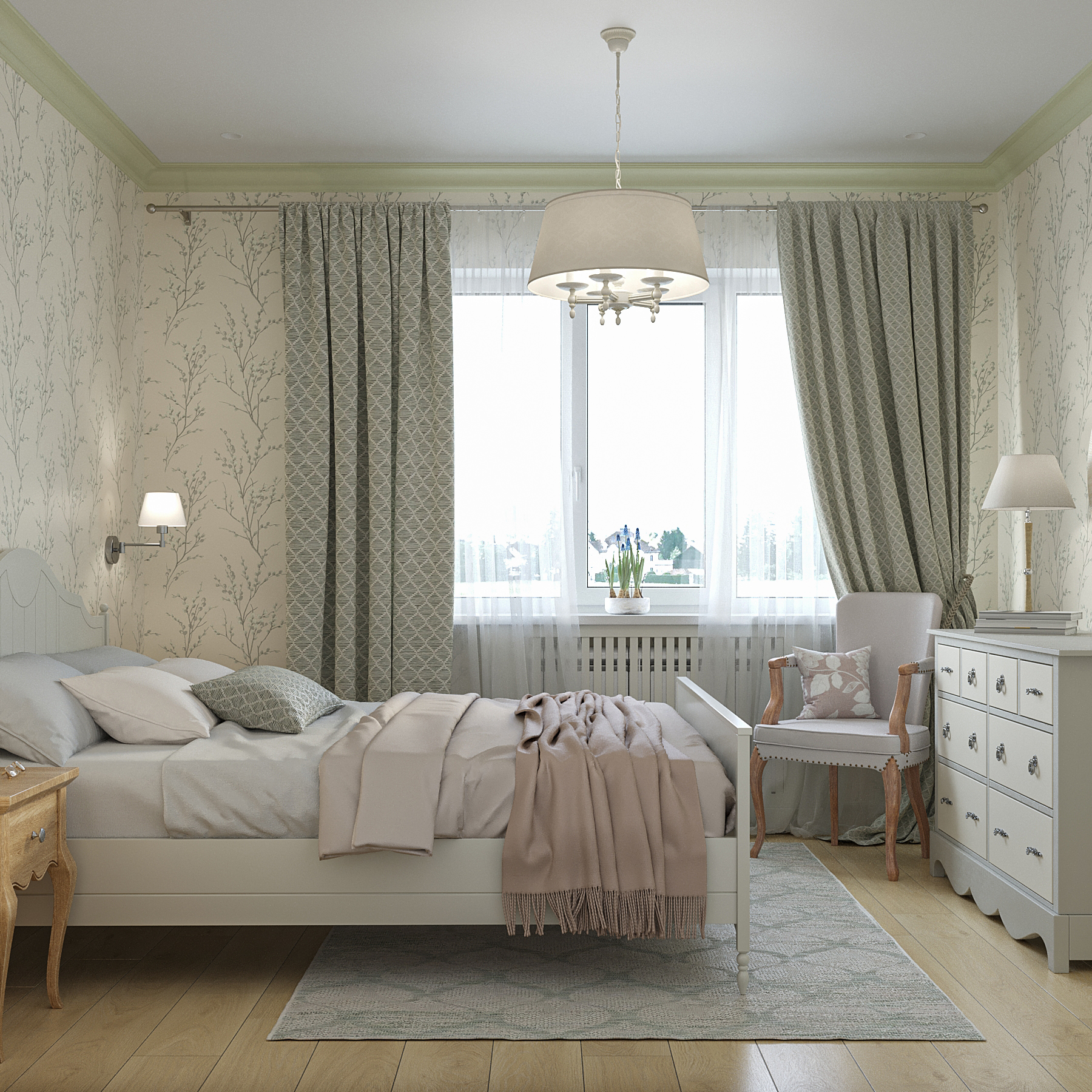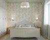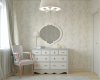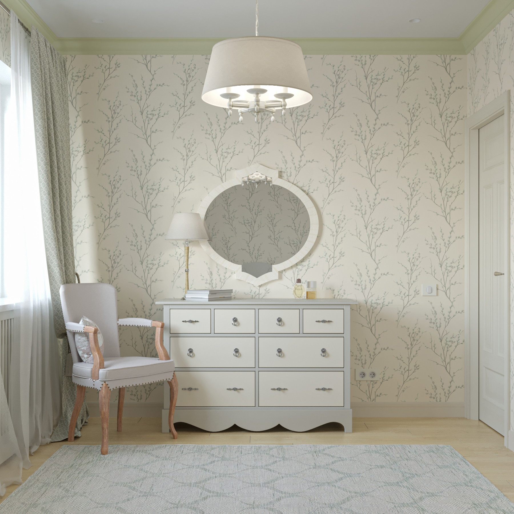 Обои с орнаментом вербочек создают чистую, добрую, уютную атмосферу спальни. Текстура дерева на полу и в прикроватных тумбах лаконично добавляет теплоты, а нежный оливковый цвет потолочных карнизов – свежести. Особое украшение напротив изголовья кровати – это зеркало интересной формы, рама которого инкрустирована белой костью. Под ним расположился комод в стиле Прованс с ажурными ручками.