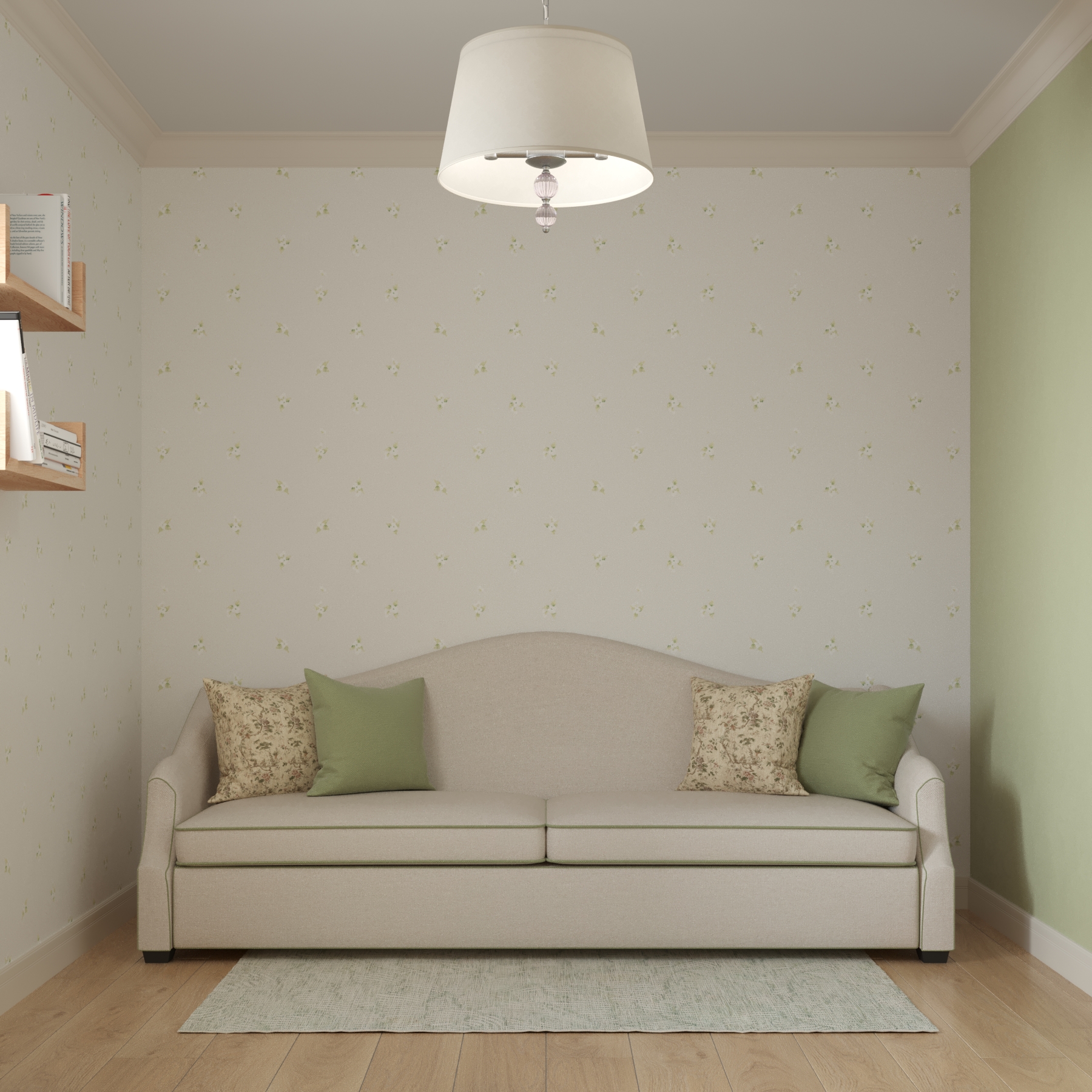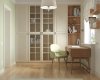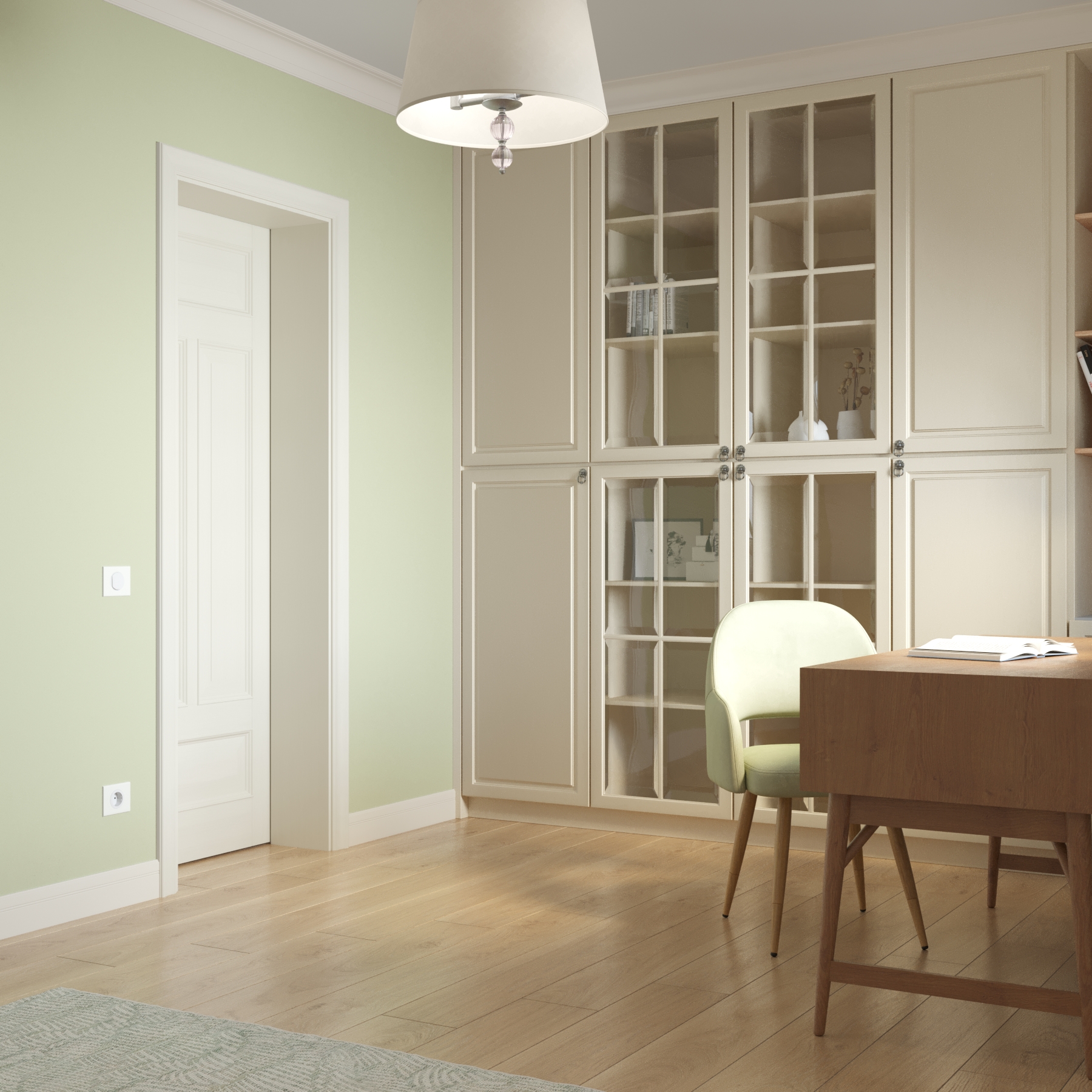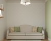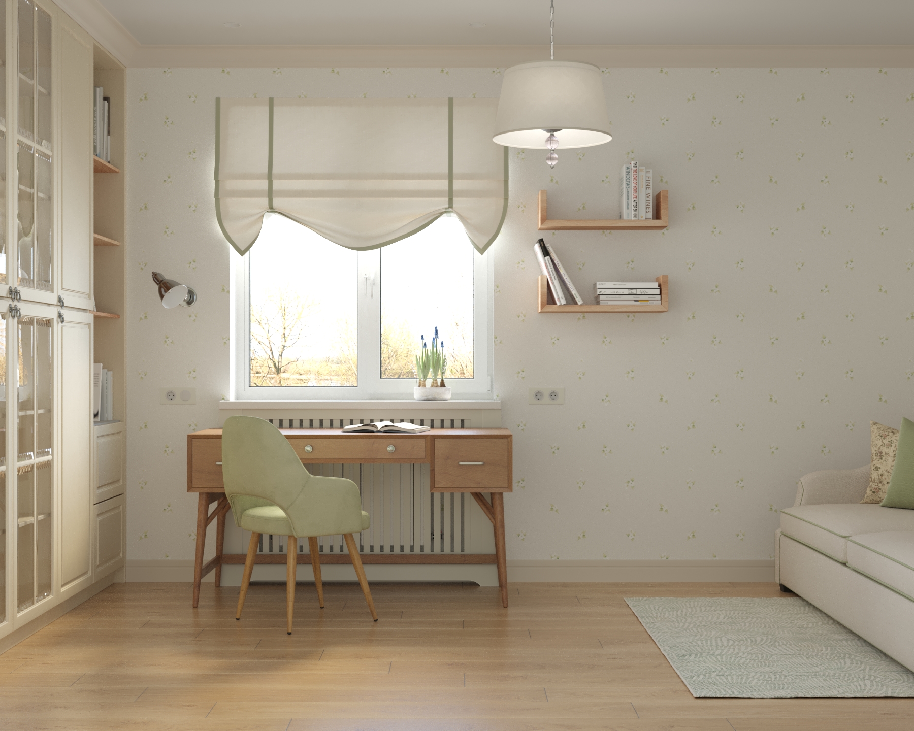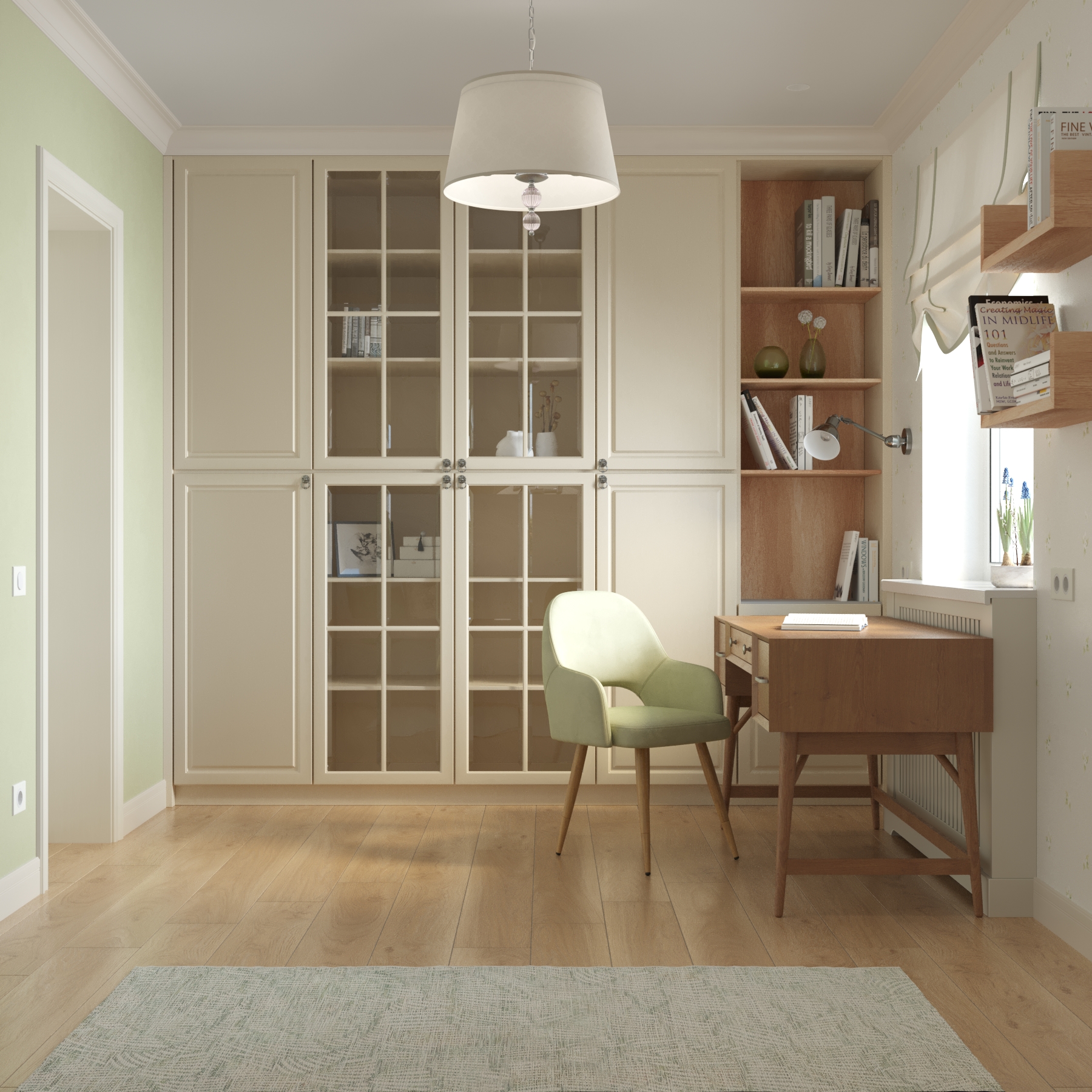 В доме предусмотрена комната широкого назначения. Она соединяет в себе библиотеку, рабочий кабинет, а также гостевую комнату с предусмотренным спальным местом на диване. Одна стена оформлена полностью встроенным шкафом, которому легкость придают дверки со стеклом и фацетами и открытые полки. Для освещения рабочего стола в темное время суток предусмотрено бра на подвижном основании. Окно обрамлено светлой римской шторой с графичными зелеными кантами и полочками для книг. В отделке комнаты использованы обои с лаконичным цветочным принтом и акцентная покраска, которая добавляет свежести.