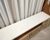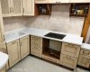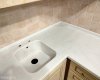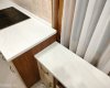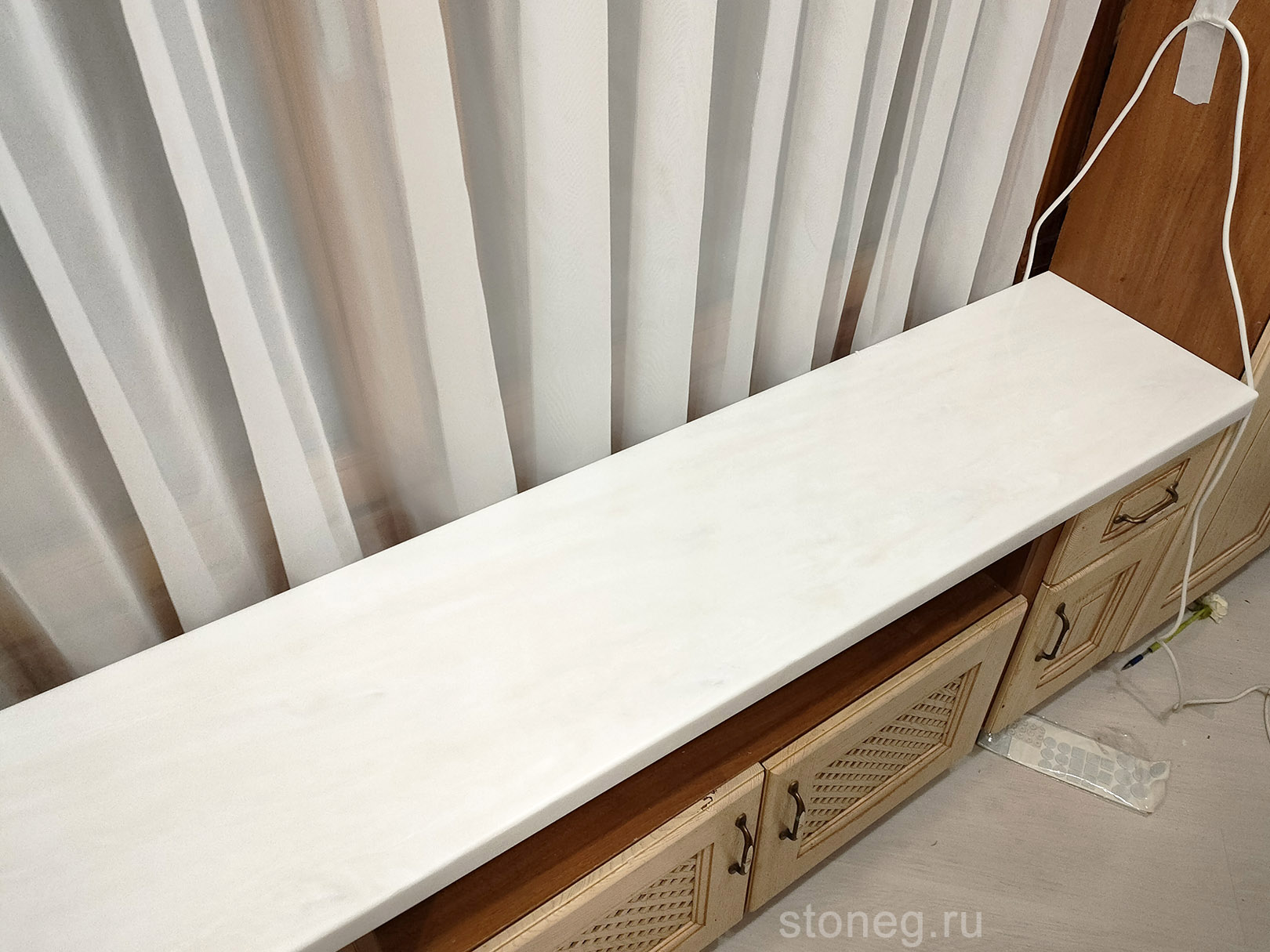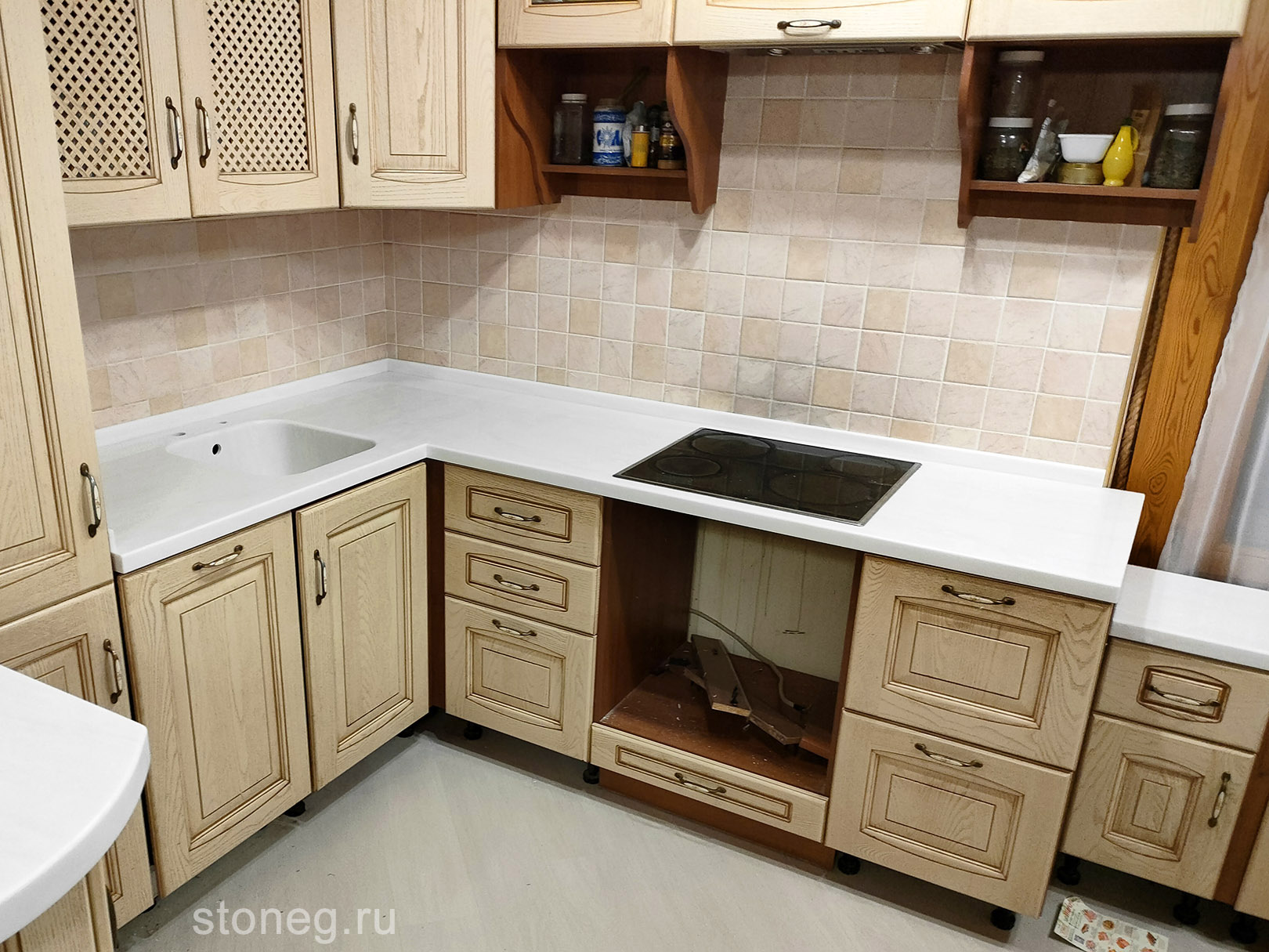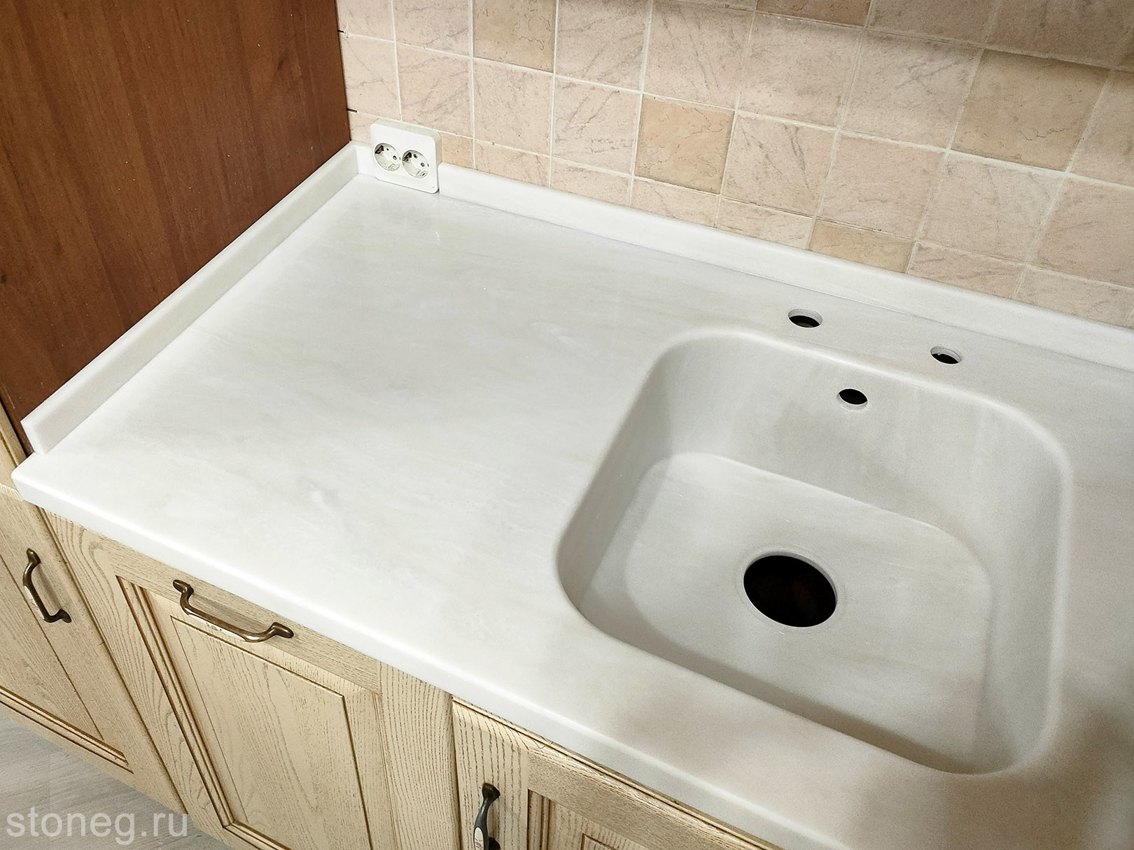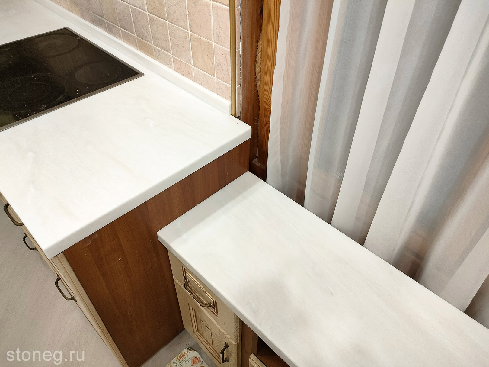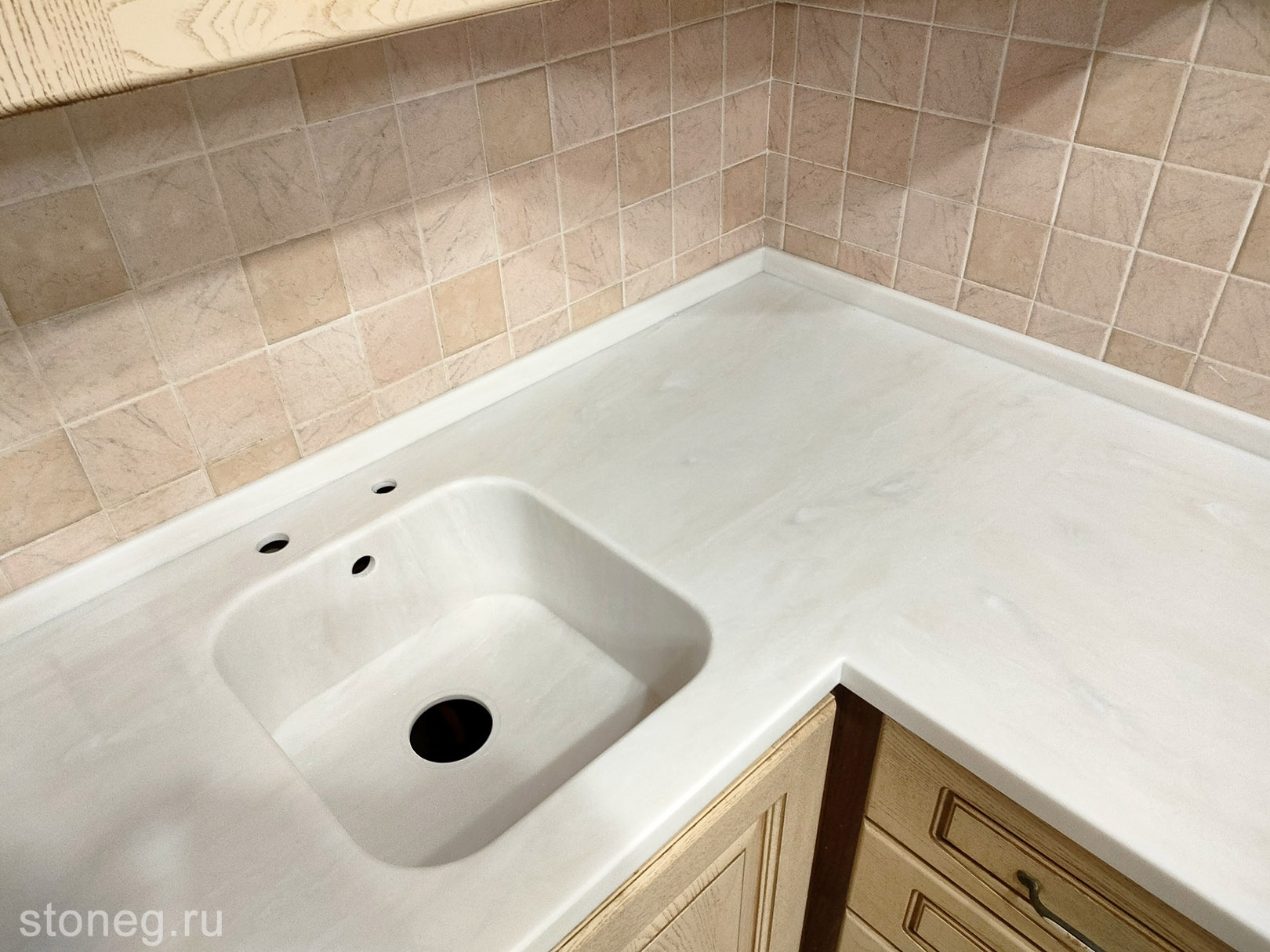 Столешница для кухни и столешница на тумбу из искусственного камня Grandex M-701 Hazel Flow Marble Ocean светло-бежевого цвета с мраморной текстурой. Столешница угловая: - Размеры: 1510х2130х600 мм. - Толщина: 38 мм. - Подгиб: да. - Борт: прямой, высотой 40 мм. - Кромка: радиусная. - Кухонная мойка: интегрированная из искусственного камня, модель R450k. Размеры: 425х400 мм. Сливное отверстие: с краю. Глубина чаши: 205 мм. - Вырезы под варочную панель, слив, смеситель, дозатор. Столешница на тумбу / мебельный модуль: - Размеры: 1579х350 мм. - Толщина: 38 мм. - Подгиб: да. - Борт: нет. - Кромка: радиусная. Обработчики: мастера компании Гермес и компании Меркурий, Санкт-Петербург.