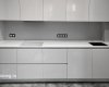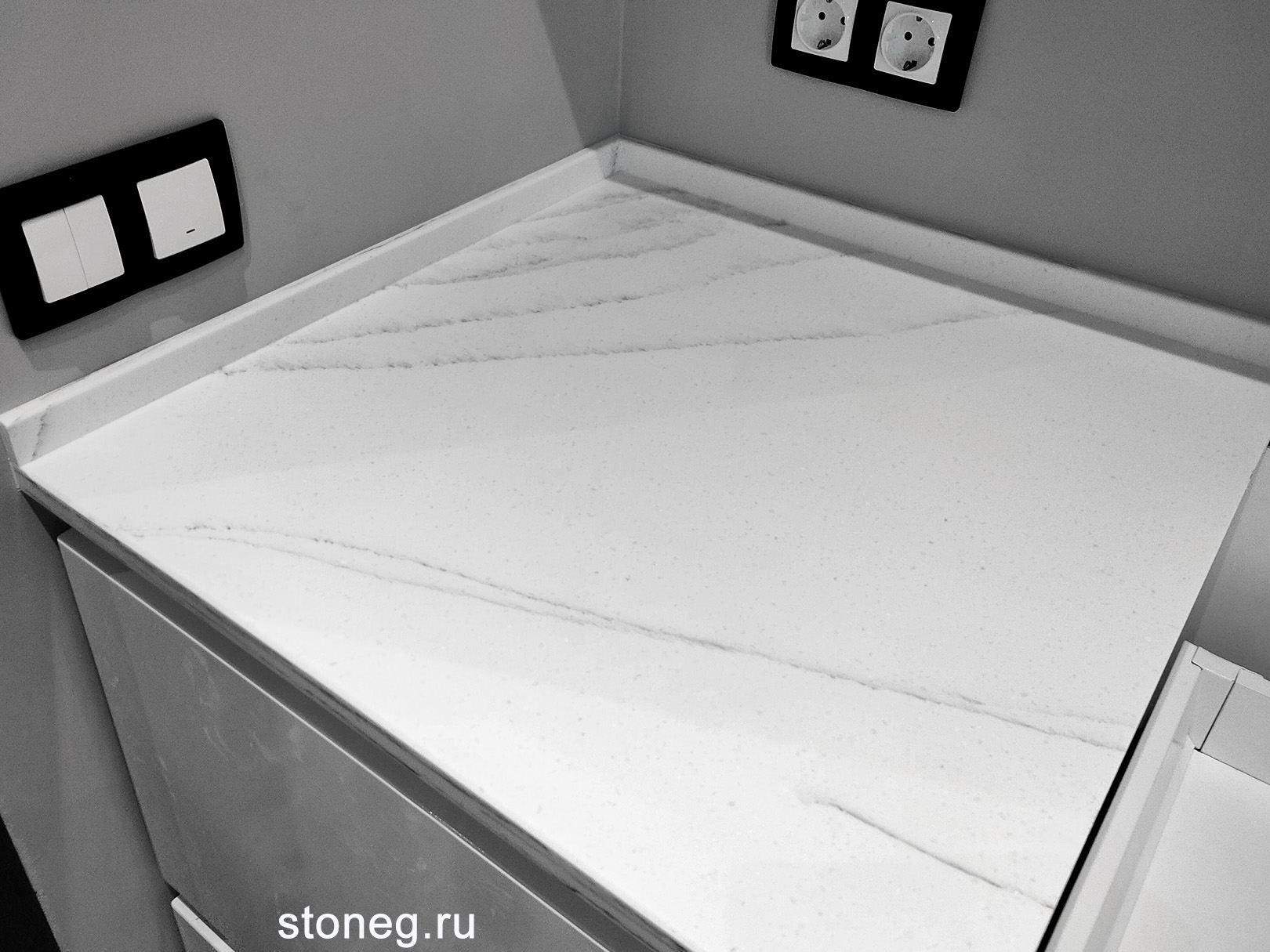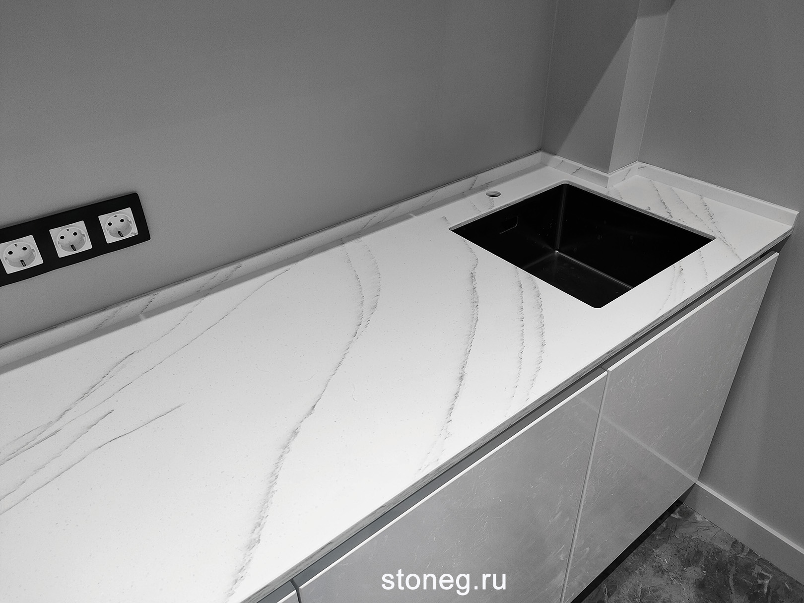 Столешница для кухни из искусственного камня Grandex C-801 Arezzo Creavice белого цвета с мраморной текстурой. - Форма столешницы: прямая, вырезан угол. - Размеры: 2978х600 мм. - Толщина: 24 мм. - Подгиб: да. - Борт: прямой, высотой 30 мм. - Кромка: фаска под 45 градусов. - Кухонная мойка: Omoikiri Taki 44-u/if GM из нержавеющей стали, подстольный монтаж. - Вырезы под варочную панель, мойку, смеситель. Обработчики: мастера компании Гермес и компании Меркурий, Санкт-Петербург.