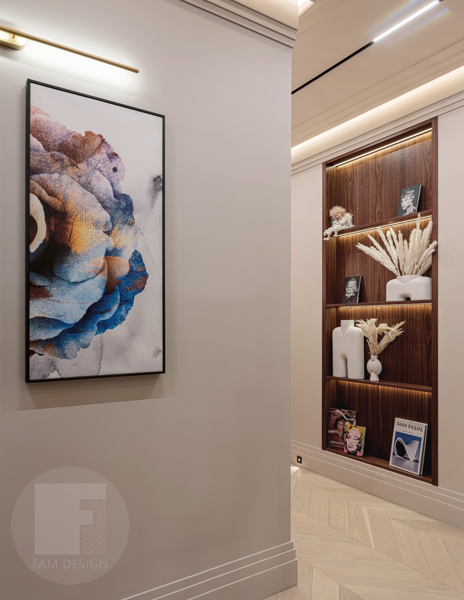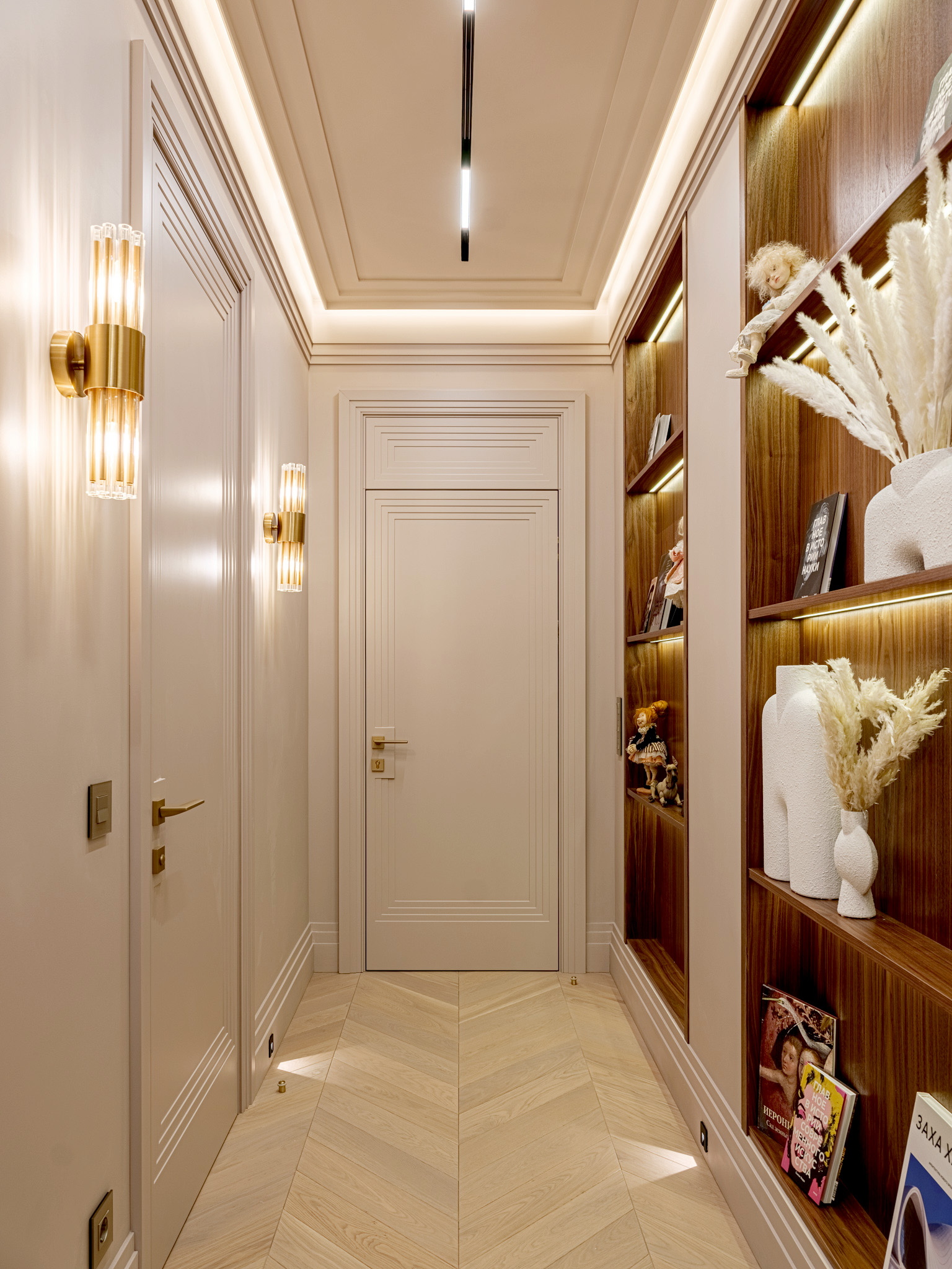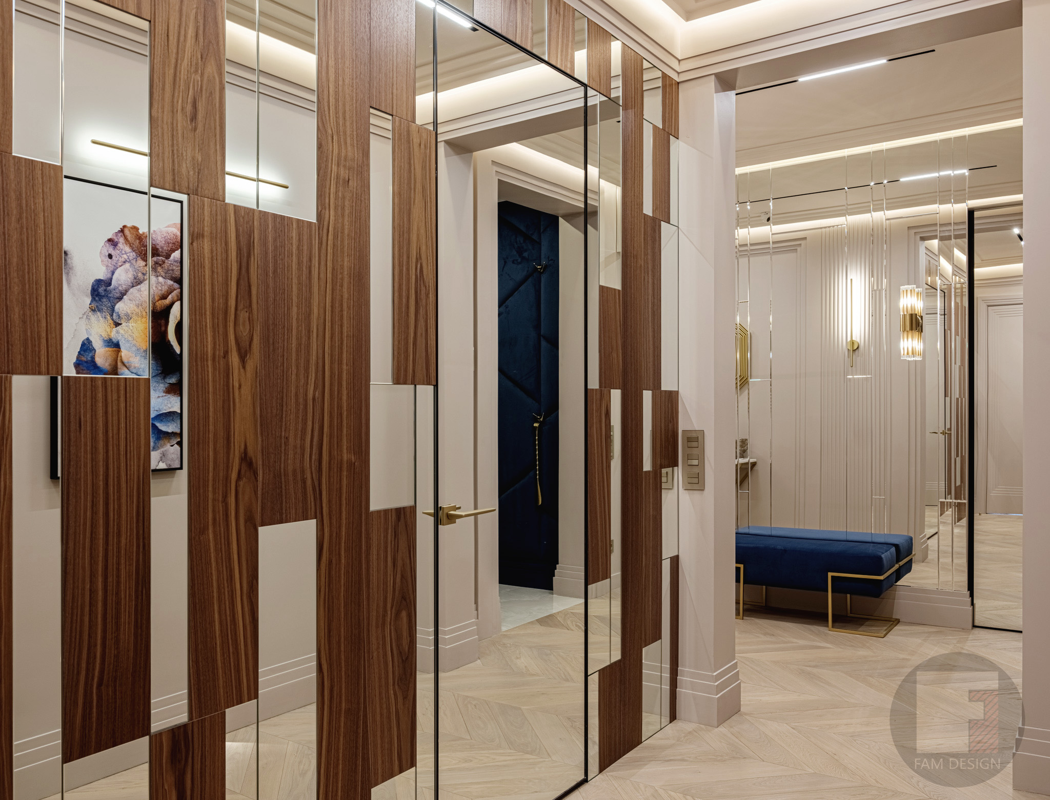 Квартира 165кв.м Объединив 2 квартиры, наши заказчики получили достаточно пространства для большой семьи. В задачах стояло создать парадный интерьер в классическом стиле, приветствовались декоративные элементы, оригинальные решения и яркие цвета. И много света – встроенного и декоративного. Этот проект, поначалу, пошел не совсем гладко – предварительная концепция показалась заказчикам слишком сдержанной, хотелось больше шика. Дизайнерам проекта пришлось пересмотреть свои взгляды на прекрасное и добавить лоску: более сложные фактуры, больше зеркал, больше декоративных элементов цвета латуни, ярче краски. Итоговое решение – компромисс между стремлением дизайнера к современным тенденциям на упрощение и желанием заказчиков получить нарядный классический интерьер. При реализации проекта пришлось потрудиться, чтобы задуманные дизайнерами сложные декоративные элементы не разорили заказчиков: было найдено множество бюджетных решений, состыковывались разные подрядчики, подбирались предметы интерьера отечественного производства, в итоге интерьер получился роскошным, а бюджет проекта - весьма умеренным!
