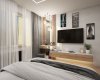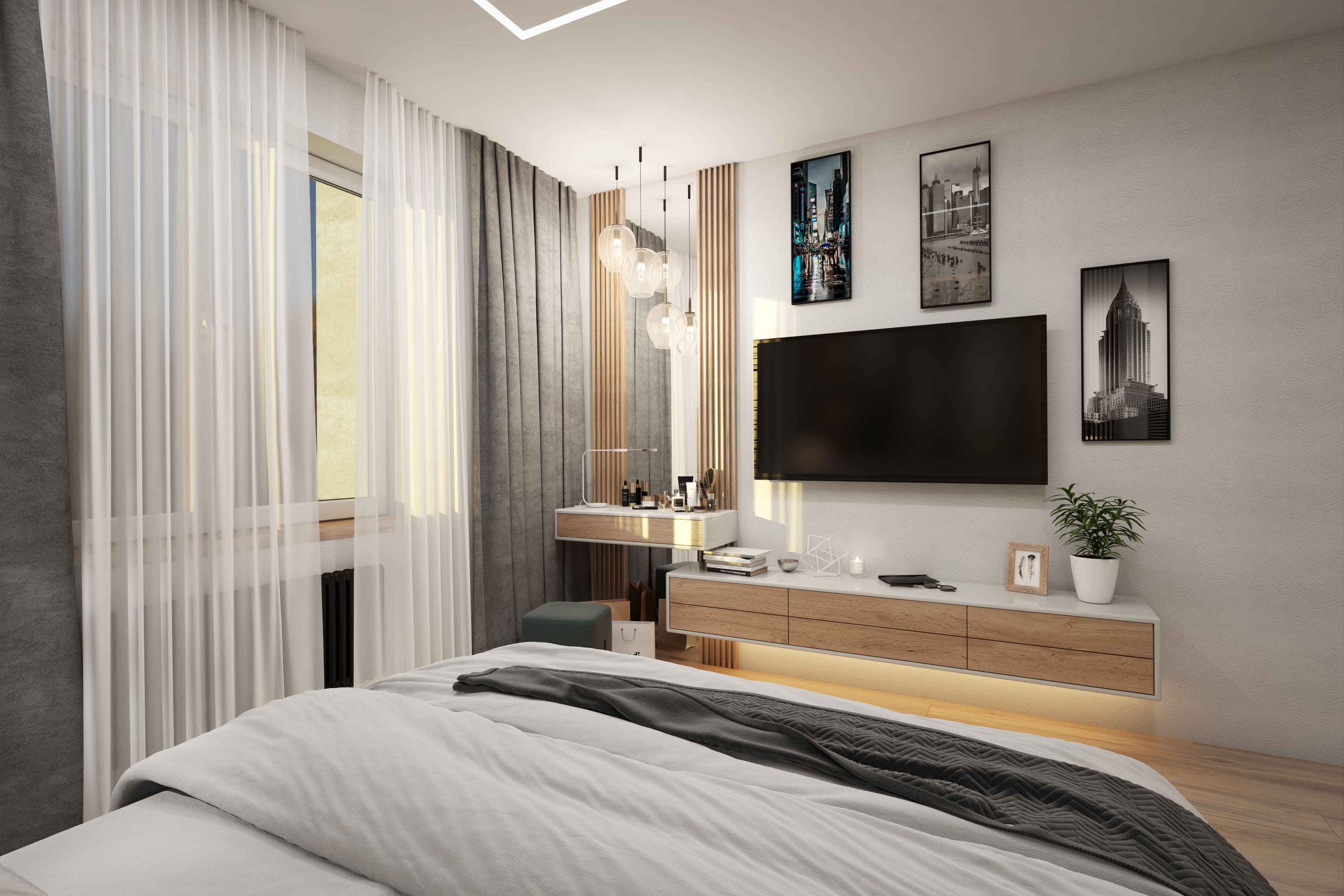 Кухня-гостиная, в этой квартире, объединена с лоджией, что, значительно расширило пространство помещения. Квартира в стиле «домашний лофт» или «лёгкий лофт». Не вполне урбанистично, но, с элементами. Основными чертами лёгкого лофта являются ярко-белые стены, которые прекрасно отражают свет и создают эффект пространства. Использование натуральных материалов, таких как дерево, кирпич и металл, придаёт интерьеру ощущение дерзкости и непосредственности. В сенузле использовался керамогранит под бетон двух тонов и керамогранит под дерево в зоне ванны.