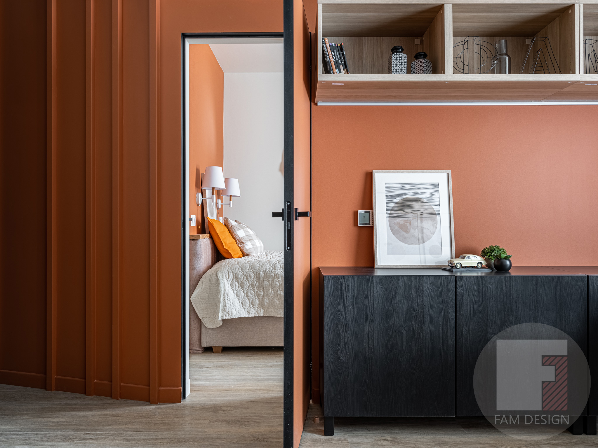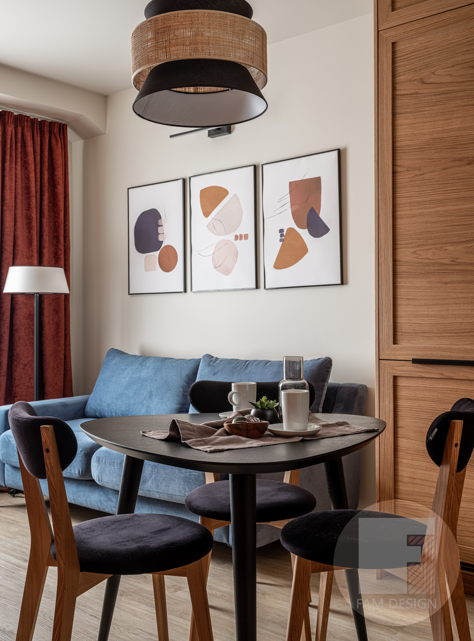Эти небольшие апартаменты наши заказчики используют во время своих частых визитов в Москву. В задачах стояло создание удобного пространства для работы и отдыха, предусмотреть места хранения и возможность работать или отдыхать не мешая друг-другу, сделать интерьер ярким и современным и уйти от банальных и ставших слишком популярными решений вроде уже поднадоевшего лофта. Маленькое помещение с большим количеством задач? Мы обожаем такие вызовы! Чтобы создать удобную планировку, пришлось поломать голову и рассмотреть множество вариантов. В итоге удалось схитрить и появился диагональный коридорчик, который не только преобразил геометрию помещения, но и позволил разместить все требуемое: 2 просторные гардеробные, удобную ванную комнату с большой душевой кабиной, стиральной машиной и возможностью не чувствовать себя как на складе сантехники). Удалось выгородить отдельную спальню и в ней рабочую зону у окна, светлую, с глубоким подоконником и красивым фоном для съемки. Проект реализован полностью - от идеи до переезда хозяев.