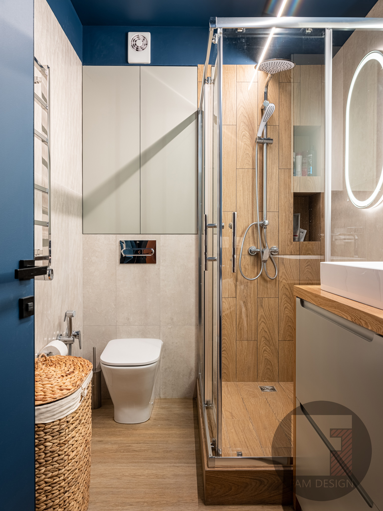 Эти небольшие апартаменты наши заказчики используют во время своих частых визитов в Москву. В задачах стояло создание удобного пространства для работы и отдыха, предусмотреть места хранения и возможность работать или отдыхать не мешая друг-другу, сделать интерьер ярким и современным и уйти от банальных и ставших слишком популярными решений вроде уже поднадоевшего лофта. Маленькое помещение с большим количеством задач? Мы обожаем такие вызовы! Чтобы создать удобную планировку, пришлось поломать голову и рассмотреть множество вариантов. В итоге удалось схитрить и появился диагональный коридорчик, который не только преобразил геометрию помещения, но и позволил разместить все требуемое: 2 просторные гардеробные, удобную ванную комнату с большой душевой кабиной, стиральной машиной и возможностью не чувствовать себя как на складе сантехники). Удалось выгородить отдельную спальню и в ней рабочую зону у окна, светлую, с глубоким подоконником и красивым фоном для съемки. Проект реализован полностью - от идеи до переезда хозяев.