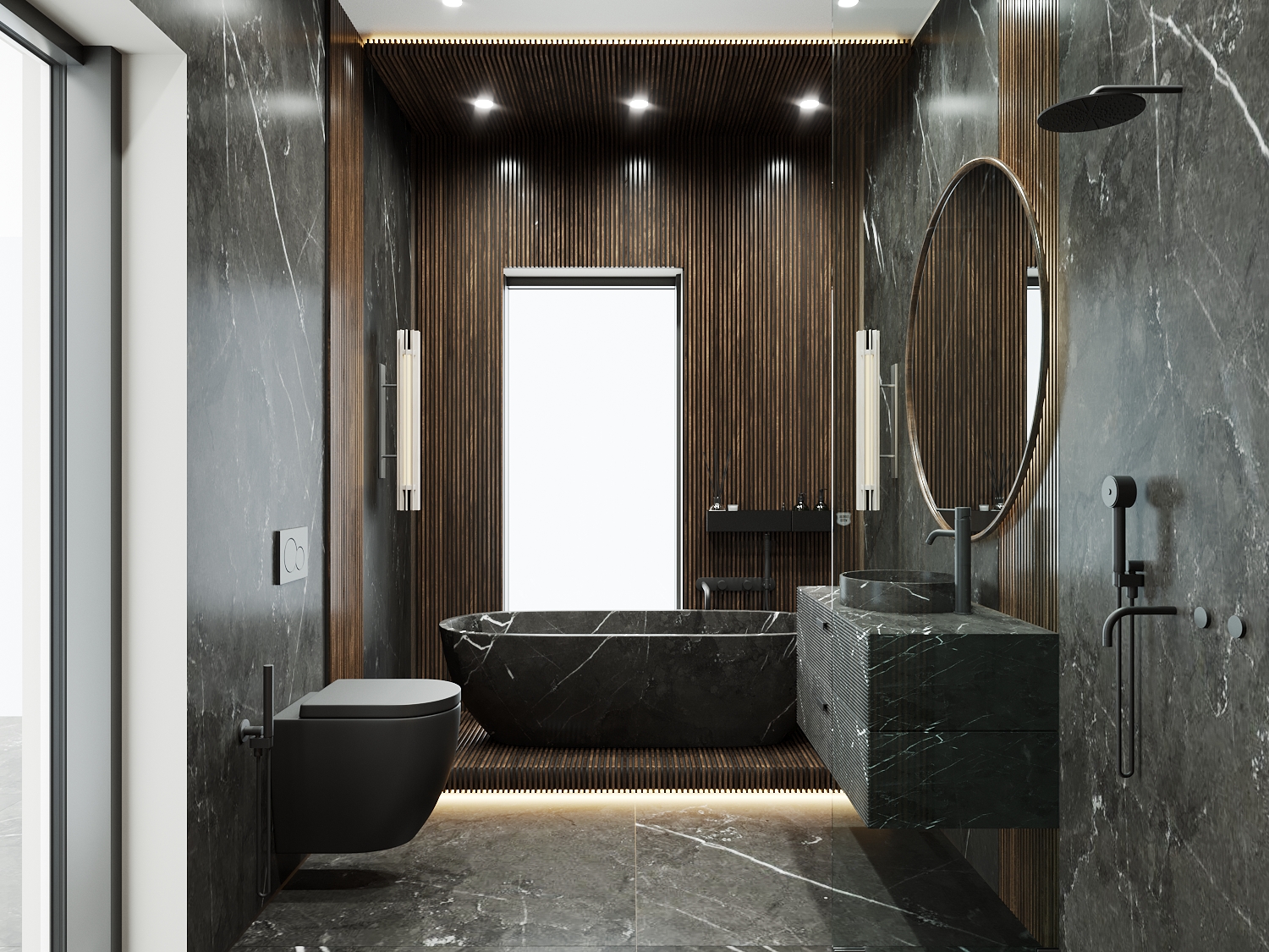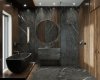 Просторная ванная комната в стиле минимализм, в которой нам удалось разместить отдельную душевую и ванну. Мебель и сантехника дублируют отделку помещения, освещение на разных уровнях создаёт романтическую атмосферу. Деревянные панели покрыты специальным SPS-покрытием, в составе которого отсутствуют гигроскопичные компоненты, поэтому они обладают стопроцентной влагостойкостью и не потеряют свой внешний вид долгие годы. Из санузла есть выход на террасу: летом можно выйти позагорать, а сразу после принять душ, а зимой понежиться в тёплой ванне.