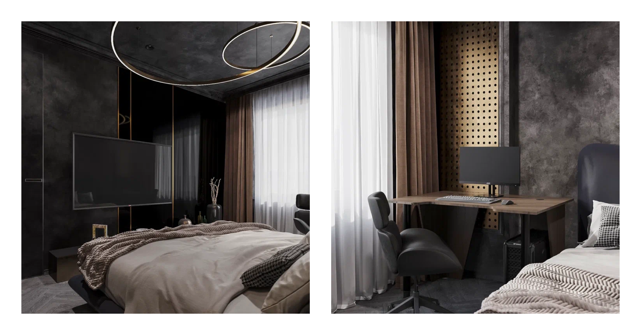 А вот и шикарная просторная спальня. Помещение выполнено в тёмных тонах с золотыми акцентами. Для того, чтобы предотвратить приступы обострения аллергии, мы изготовили кровать из натуральной кожи. Под кровать сможет проезжать робот-пылесос для сбора пыли. Рядом с кроватью находится компьютерный стол с кожаным удобным креслом.