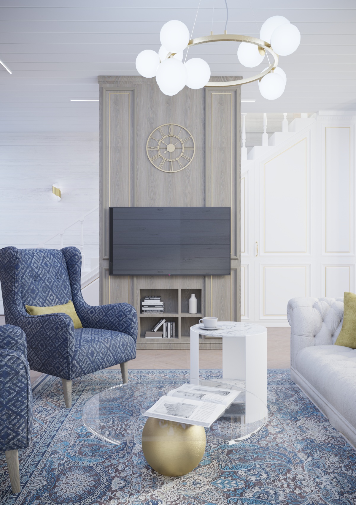 Дом выполнен в классическом стиле. Заказчики брали полный проект со всеми чертежами, визуализациями и авторским надзором. Светлые тона- это было главное пожелание. Мне кажется они отлично передают легкость , эстетику и отлично сочетаются с природным пейзажем за окном.