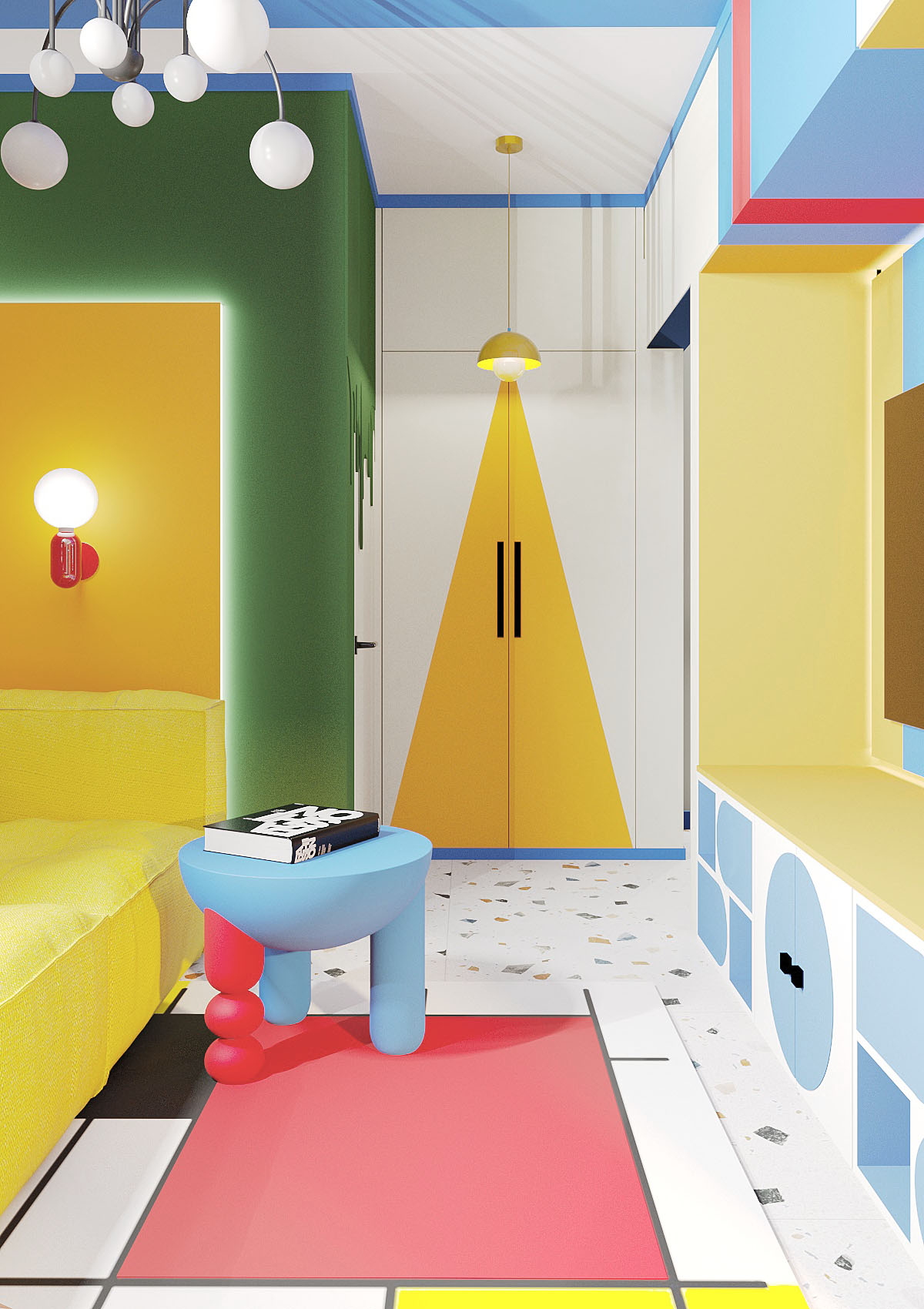 Эта квартира создана в ярких цветах с элементами авангарда, отражает влияние работ художников-авангардистов, таких как Василий Кандинский и Казимир Малевич. Основные элементы интерьера включают яркие цвета (насыщенный синий, жёлтый, красный, зелёный ) геометрические формы и линии, а также использование современных материалов и технологий. Создавая этот смелый интерьер, хотелось показать, что квартира может быть не просто обыденным жильем, но настоящим произведением искусства. Смотря на мебель, стены и все предметы находящийся в квартире, складывается ощущение, что там побывал художник и расписал все вокруг. Где-то пролилась краска, в каких-то местах он рисовал не отрывая кистью от предмета к предмету, соединяя их в единую композицию. Квартира представлялась нам свободным холстом, который очень ярко заиграл в руках художника, вдохновившегося авангардистами прошлого века.