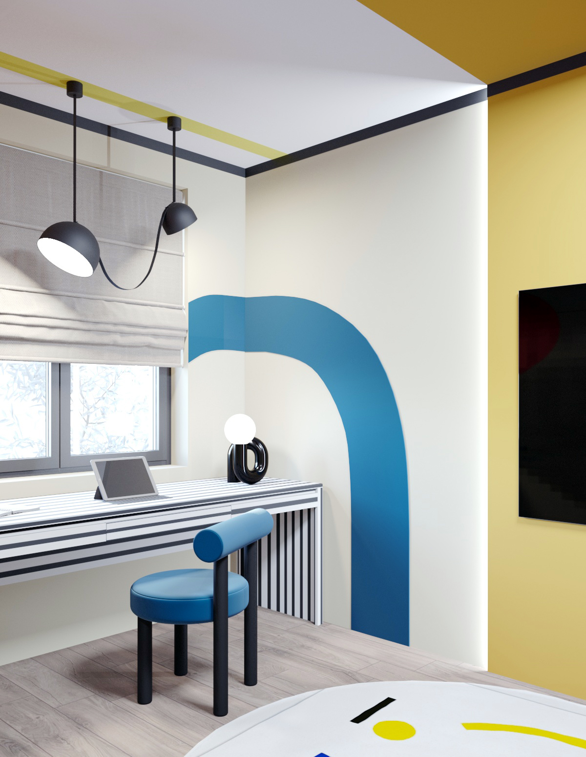 Эта квартира создана в ярких цветах с элементами авангарда, отражает влияние работ художников-авангардистов, таких как Василий Кандинский и Казимир Малевич. Основные элементы интерьера включают яркие цвета (насыщенный синий, жёлтый, красный, зелёный ) геометрические формы и линии, а также использование современных материалов и технологий. Создавая этот смелый интерьер, хотелось показать, что квартира может быть не просто обыденным жильем, но настоящим произведением искусства. Смотря на мебель, стены и все предметы находящийся в квартире, складывается ощущение, что там побывал художник и расписал все вокруг. Где-то пролилась краска, в каких-то местах он рисовал не отрывая кистью от предмета к предмету, соединяя их в единую композицию. Квартира представлялась нам свободным холстом, который очень ярко заиграл в руках художника, вдохновившегося авангардистами прошлого века.