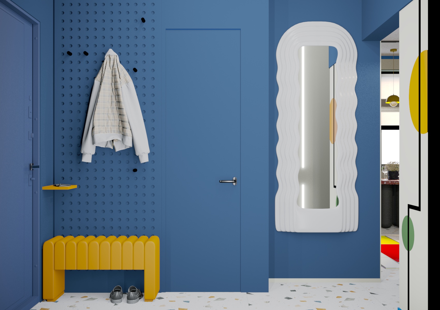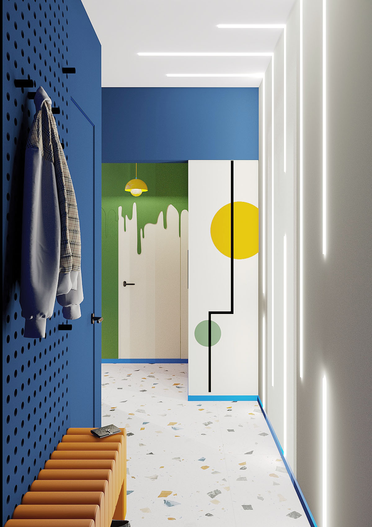 Эта квартира создана в ярких цветах с элементами авангарда, отражает влияние работ художников-авангардистов, таких как Василий Кандинский и Казимир Малевич. Основные элементы интерьера включают яркие цвета (насыщенный синий, жёлтый, красный, зелёный ) геометрические формы и линии, а также использование современных материалов и технологий. Создавая этот смелый интерьер, хотелось показать, что квартира может быть не просто обыденным жильем, но настоящим произведением искусства. Смотря на мебель, стены и все предметы находящийся в квартире, складывается ощущение, что там побывал художник и расписал все вокруг. Где-то пролилась краска, в каких-то местах он рисовал не отрывая кистью от предмета к предмету, соединяя их в единую композицию. Квартира представлялась нам свободным холстом, который очень ярко заиграл в руках художника, вдохновившегося авангардистами прошлого века.