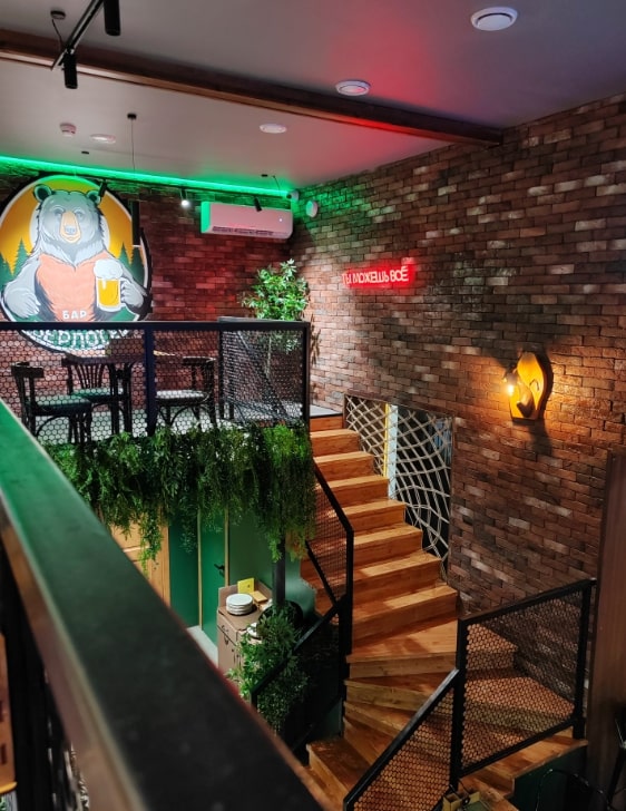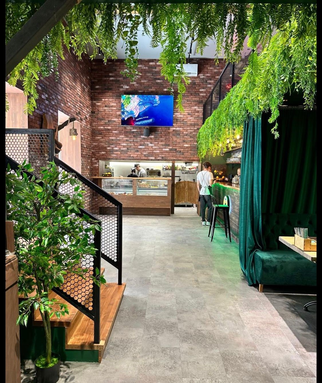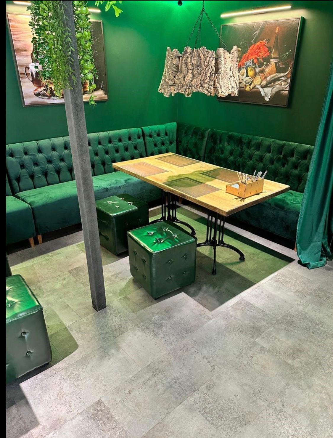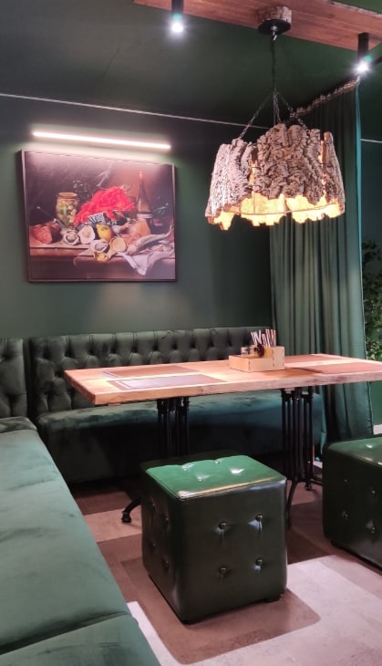 Бар расположен в самом центре Адлера, на набережной Черного моря. Основная задача была создать атмосферу уюта и дружелюбия, способствующую расслаблению и общению. На проект и его реализацию ушло три месяца. В основе интерьера лежит зеленый цвет и дерево. Особое место в интерьере занимают светильники, созданные по моему эскизу из коры пробкового дерева, а так же зеркало в санузле из дрифтвуда.