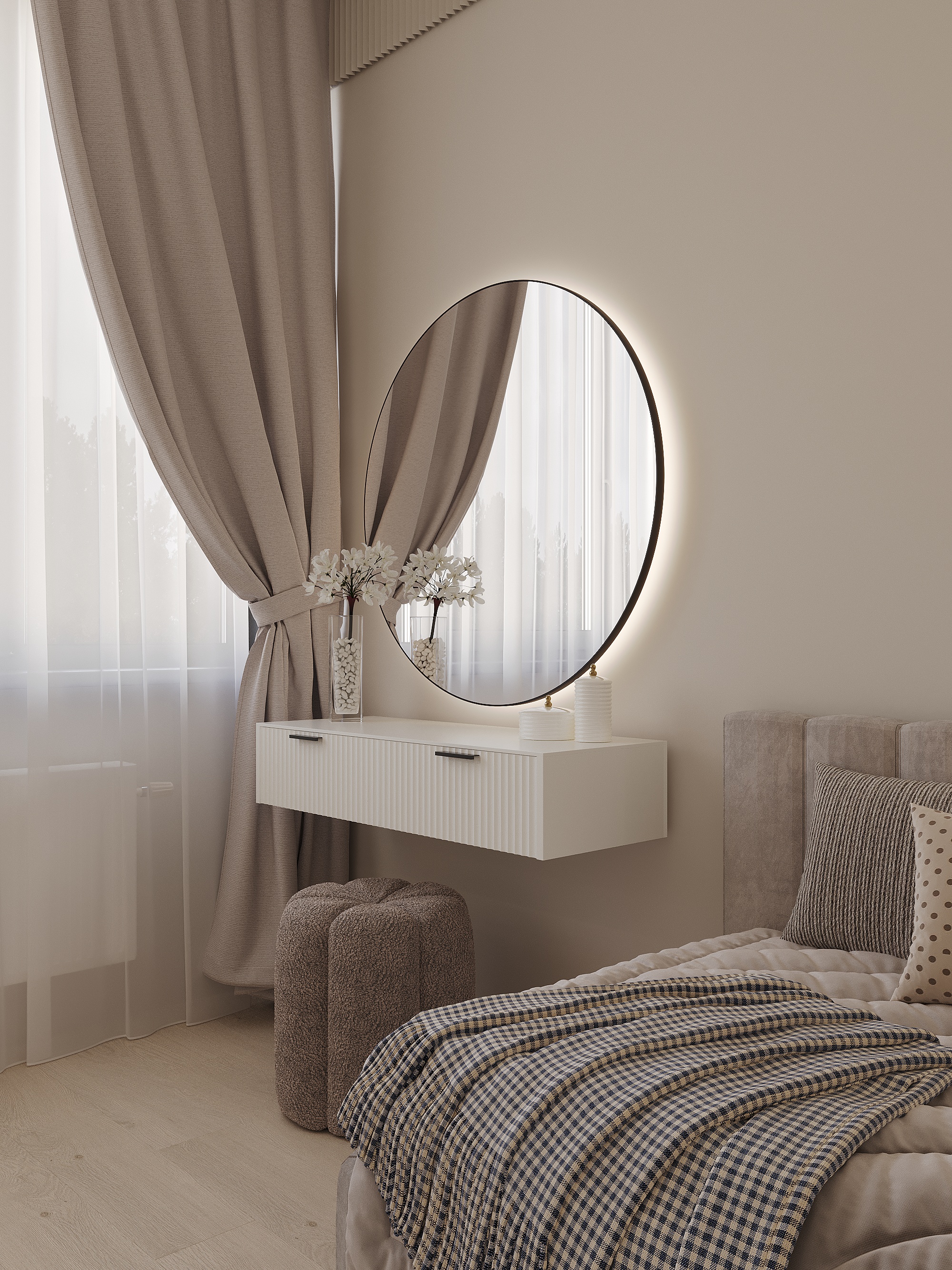 Изначально это было двушка 89м2 с кухней в центре и несколькими коридорами. Мы убрали стену, перенеся часть кухни в коридор, что позволило нам увеличить пространство и сделать уютную кухню -гостиную. Данная перепланировка позволила нам увеличить размеры с 14,76м2, до 17,73м2. В гостиной поставили большое зеркало, которое зрительно увеличивает пространство и добавляет "воздуха" Квартира выполнена в светлых тонах, стены покрашены в цвет "S 1502-Y50R" из палитры NCS - это нейтральный и утонченный оттенок. Этот цвет обладает нотками мягкого серого, но с теплым подтоном, который придает ему уют и комфорт. Этот оттенок является универсальным и способен придать помещению ощущение спокойствия и гармонии. Напольное покрытие в квартире комбинированное. На кухне используется Керамогранит Realistik Oak Wood Crema Punch 20x120 В жилых комнатах виниловый ламинат VINLAM Дуб Валенсия В ванной, для зонирования мы использовали стеклоблоки, которые отлично справились с задачей, но при этом не затенили помещение. В спальне на стенах используются комбинация стеновых панелей. Так же для декора монтированы черные профиля на стенах. Квартира получилась нежная и светлая.