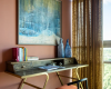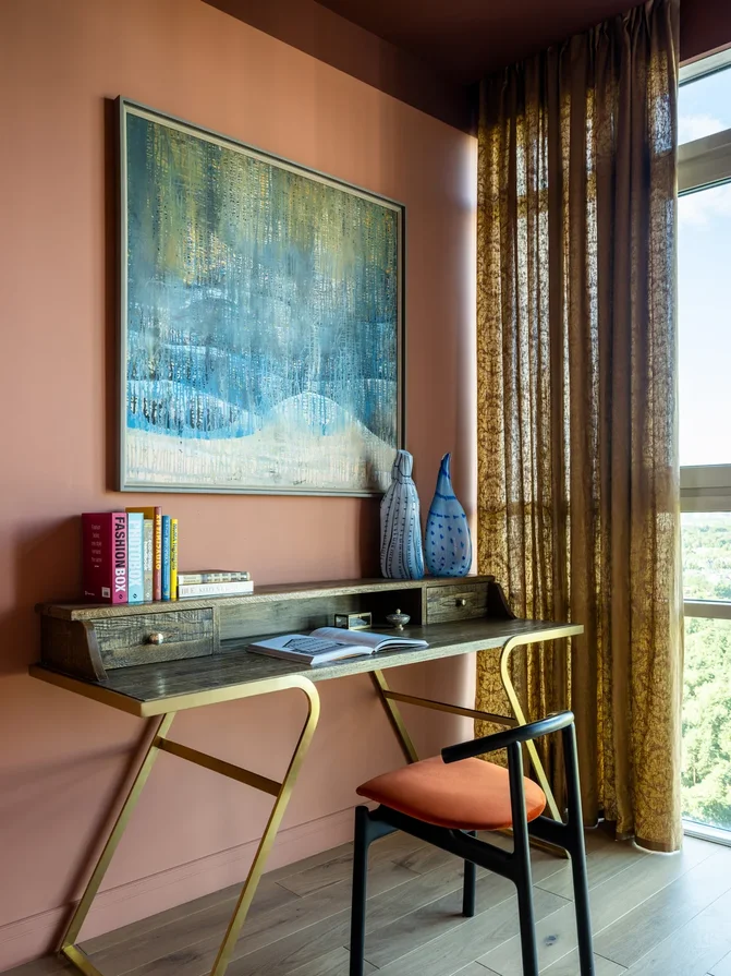 Зодиак. Покровское-Стрешнево 86 кв.м. Москва Интерьер построен вокруг ретро-палитры в серо-голубых оттенках и терракоты с ярким акцентом в ванной. Создавая ретро-настроение, выбирали мебель с характерными силуэтами того времени и предметы mid- century. Проект получился, как кадр из старого фильма, — сдержанный, стильный и романтичный.