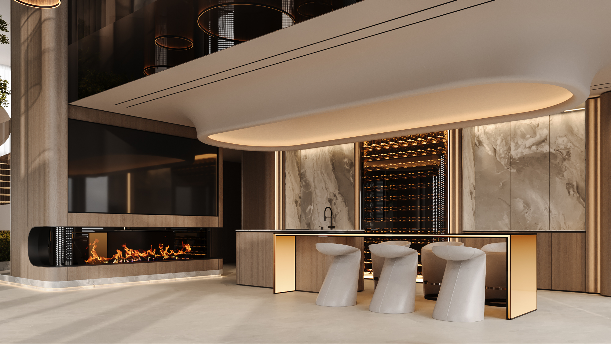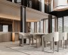 Команда студии разработала интерьер двухуровневого пентхауса площадью более 1000 м², расположенного в самом сердце современного мегаполиса. Главной идеей было сформировать пространство, в котором можно отдохнуть, расслабиться и перезагрузиться после пребывания в агрессивной среде большого города с его шумом, информационными и цифровыми перегрузками. Этой концепции прекрасно соответствует один из авторский стилей студии - Nature, в основе которого лежат визуальная простота, функциональность каждой детали, натуральные цвета и материалы. Гостиная расположена на двух этажах, частично объединенных в единое пространство, имеет высоту потолков более 7 метров и двойной свет – два ряда окон, расположенных друг над другом. Кроме того, дизайнеры объединили зону отдыха, обеденную зону и кухню. Благодаря этому в гостиной много свободного места, света и воздуха. Стены отделаны шпоном натурального дерева приятного для глаз бежевого цвета. С ними отлично гармонируют удобная мягкая мебель и журнальный столик из мрамора в зоне отдыха. Центральным декоративным элементом этой зоны является огромная роскошная люстра, спускающаяся с потолка. Яркая каскадная люстра над столом также является украшением обеденной зоны. В кухне все подчинено эстетике минимализма. Техника, места для хранения, светильники и даже камин – все интегрировано и при необходимости скрывается за фасадами стен и мебели. Центром композиции является современный остров с необычными минималистичными стульями. В интерьере много живых зеленых растений, собранных в композиции по принципам ландшафтного дизайна и подсвеченных яркими напольными светильниками-шарами. Вечером они делают атмосферу в комнате волшебной. На второй этаж можно подняться по дизайнерской лестнице с подсветкой ступеней и перилами из тонированного стекла. Наверху нас встречает видовая галерея с декоративными колоннами и дополнительная зона отдыха для тех, кому хочется уюта и уединения. Здесь же расположены спальни для владельцев пенхауса и их гостей. Пентхаус– настоящий оазис тишины, спокойствия и релаксации посреди мегаполиса.